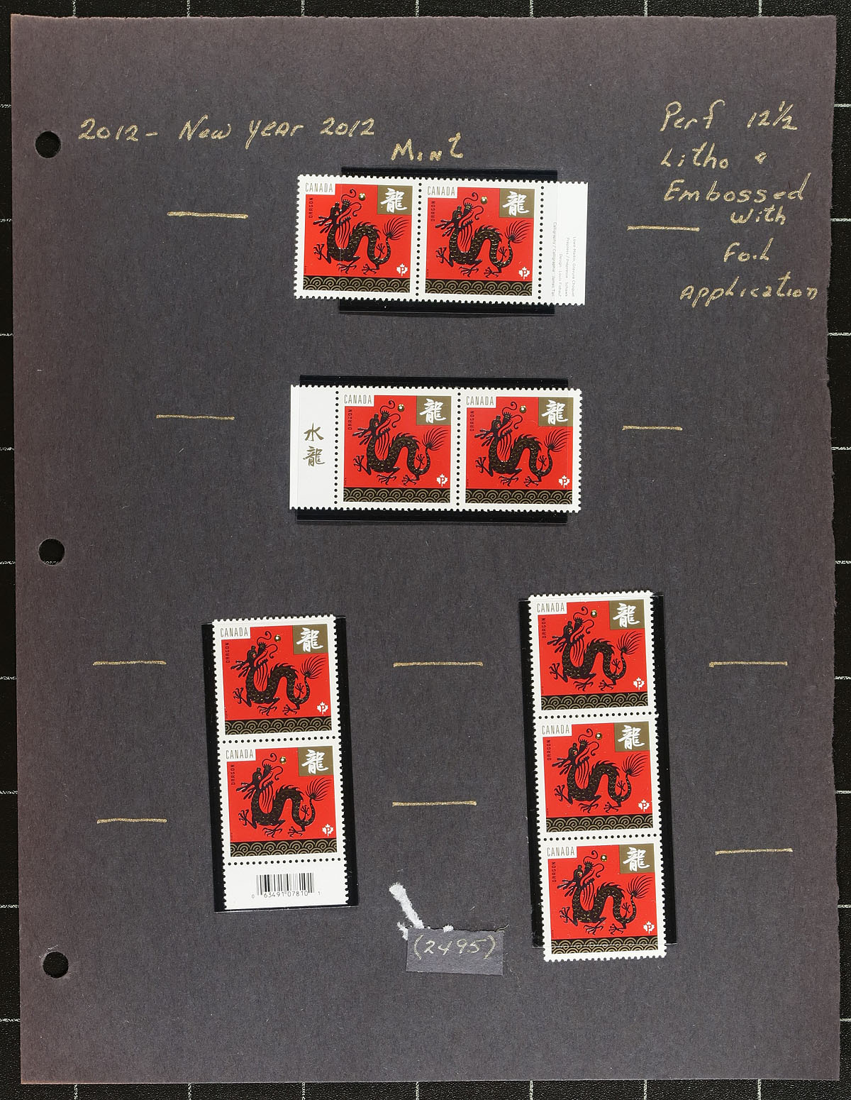 Collection of primarily mint never hinged Canada, from January 2012, covering Unitrade #s 2495-2497, 2505-2509, all in hingeless mounts in over 20 well described pages. The collection contains "Year of the Dragon" and "Baby Wildlife" coil definitives noting mint and used singles (including booklet stamps), matched set of plate blocks, along with a few souvenir sheets, coil singles, pairs, strips of 4, booklets, and first day covers. We note a few items cataloguing $10.0 and up. Face value alone totals $129.00 (including 39x "P" stamps). A nice group for all collectors. 2024 Unitrade =