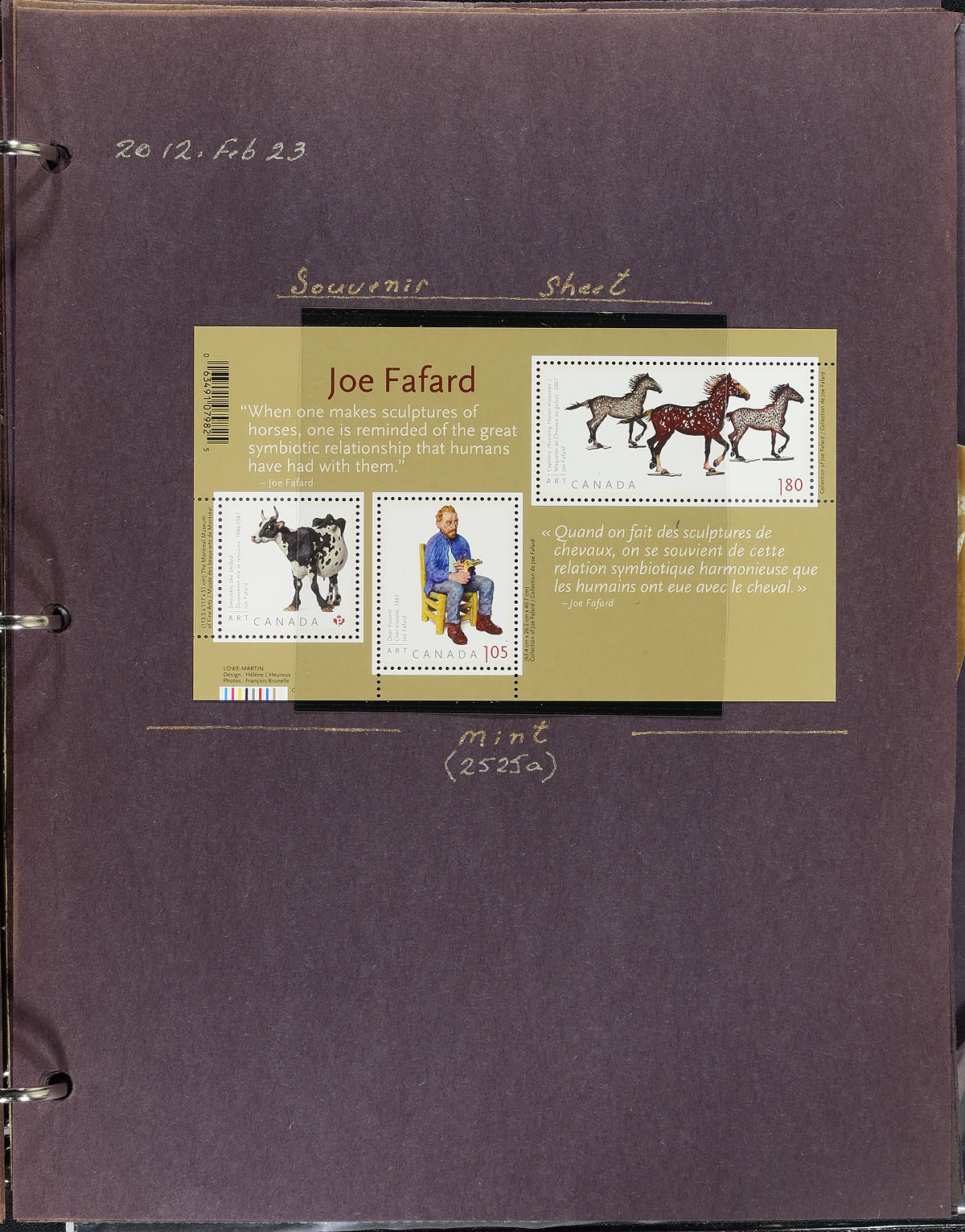 Collection of primarily mint never hinged Canada, from January to February of 2012, covering Unitrade #s 2512/2525 (missing only a few issues), all in hingeless mounts in over 30 well described pages housed in a binder. The collection contains mint and used singles, souvenir sheets, booklets, and a few first day covers. We note a few items cataloguing $10.00 and up. Face value alone totals $257.00 (including 154x "P" stamps). A nice group for all collectors. 2024 Unitrade =