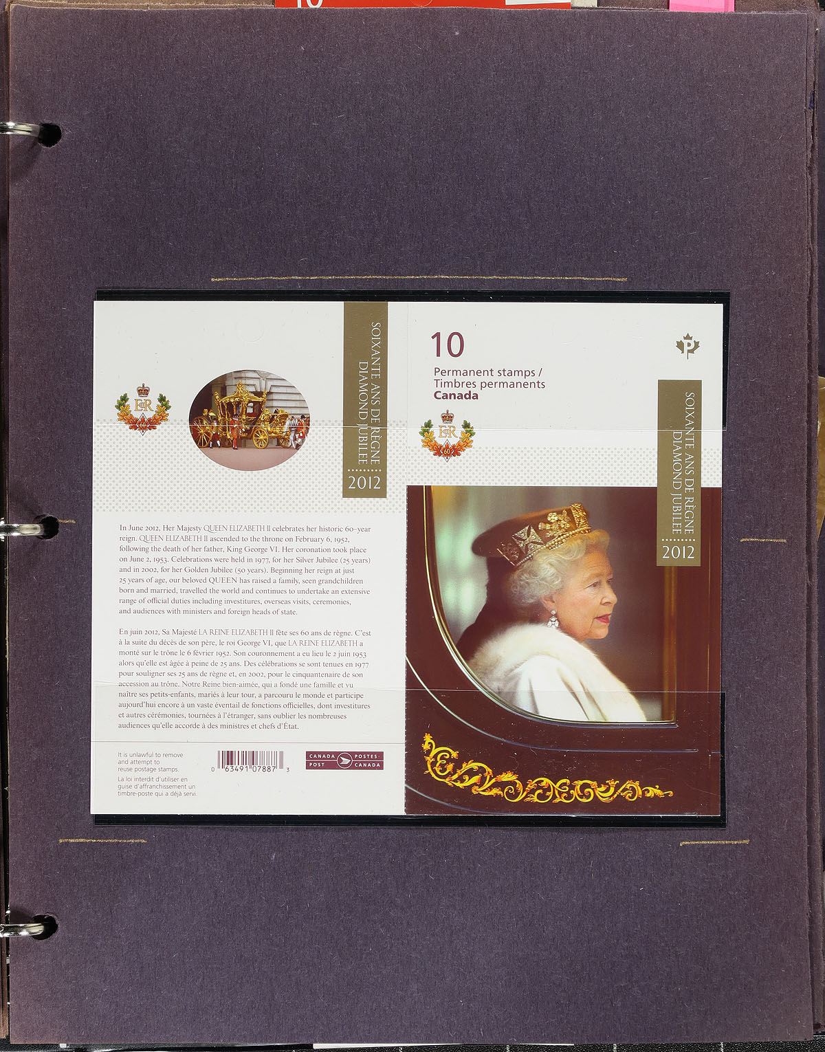 Collection of primarily mint never hinged Canada, from January to February of 2012, covering Unitrade #s 2512/2525 (missing only a few issues), all in hingeless mounts in over 30 well described pages housed in a binder. The collection contains mint and used singles, souvenir sheets, booklets, and a few first day covers. We note a few items cataloguing $10.00 and up. Face value alone totals $257.00 (including 154x "P" stamps). A nice group for all collectors. 2024 Unitrade =