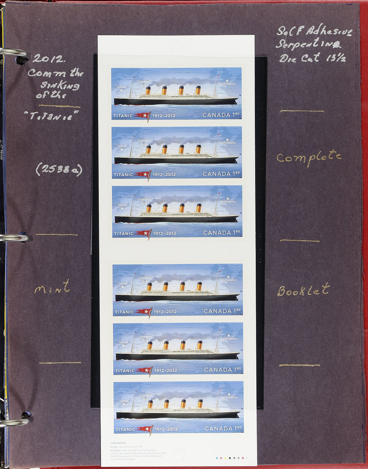 Lovely collection of primarily mint never hinged Canada, from March to April of 2012, covering Unitrade #s 2526-2538, all in hingeless mounts in over 20 well described pages housed in a binder. The collection contains mint and used singles, coil singles, pairs, strips of 4, souvenir sheets (mint and used), sheetlets, booklets, and a few first day covers. We note a few items cataloguing $10.00 and up. Face value alone totals $181.00 (including 122x "P" stamps). A nice group for all collectors. 2024 Unitrade =