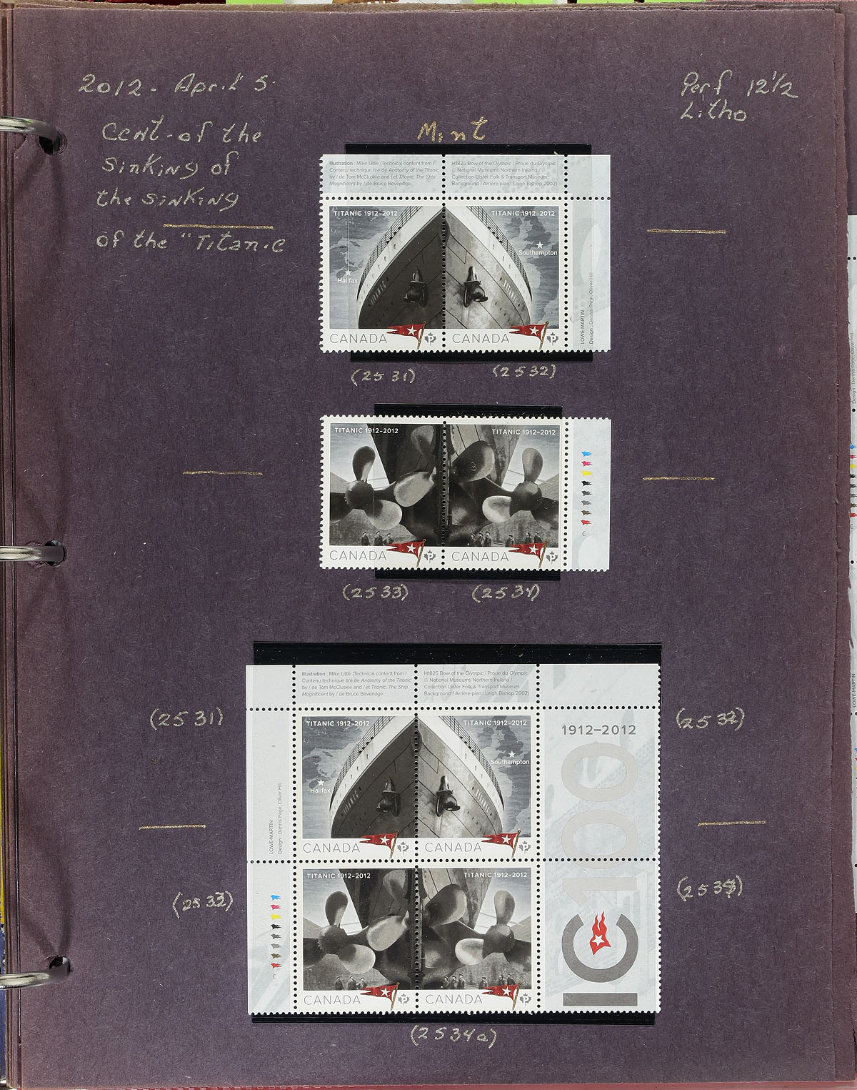 Lovely collection of primarily mint never hinged Canada, from March to April of 2012, covering Unitrade #s 2526-2538, all in hingeless mounts in over 20 well described pages housed in a binder. The collection contains mint and used singles, coil singles, pairs, strips of 4, souvenir sheets (mint and used), sheetlets, booklets, and a few first day covers. We note a few items cataloguing $10.00 and up. Face value alone totals $181.00 (including 122x "P" stamps). A nice group for all collectors. 2024 Unitrade =