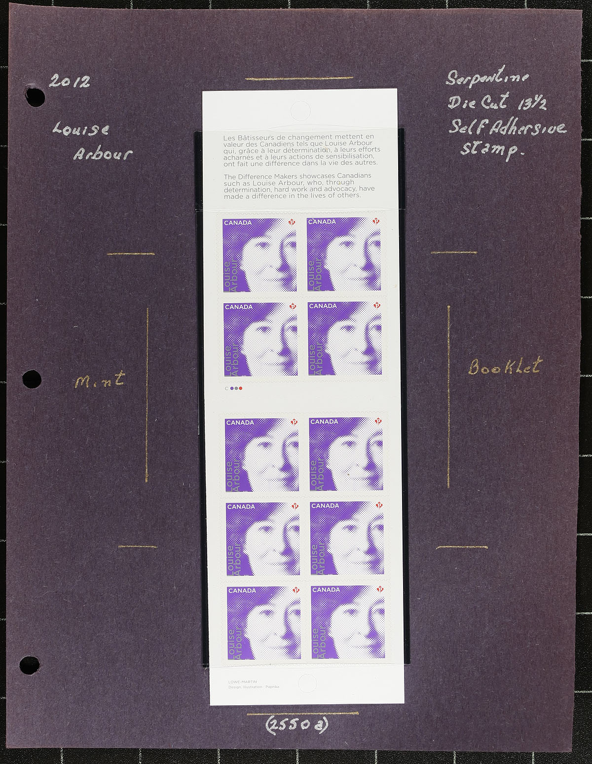 In-depth collection of primarily mint never hinged "Difference Makers" issues, May 2012, covering Unitrade #s 2549-2553, all in hingeless mounts in roughly 20 well described pages. The collection contains a mint and used souvenir sheet, along with 2 complete booklets for each issue, along with mint and used singles, and a few first day covers. We note a few items cataloguing $10.00 and up. Face value alone totals $124.00 (including 100x "P" stamps). A nice group for all collectors. Undervalued, especially compared to the face value. 2024 Unitrade =