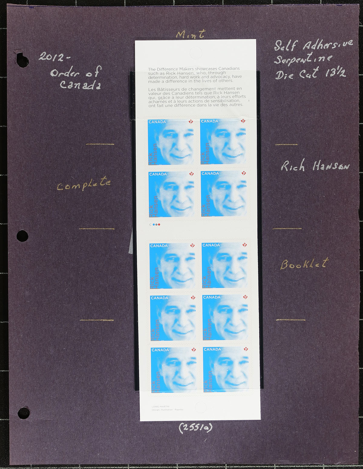 In-depth collection of primarily mint never hinged "Difference Makers" issues, May 2012, covering Unitrade #s 2549-2553, all in hingeless mounts in roughly 20 well described pages. The collection contains a mint and used souvenir sheet, along with 2 complete booklets for each issue, along with mint and used singles, and a few first day covers. We note a few items cataloguing $10.00 and up. Face value alone totals $124.00 (including 100x "P" stamps). A nice group for all collectors. Undervalued, especially compared to the face value. 2024 Unitrade =