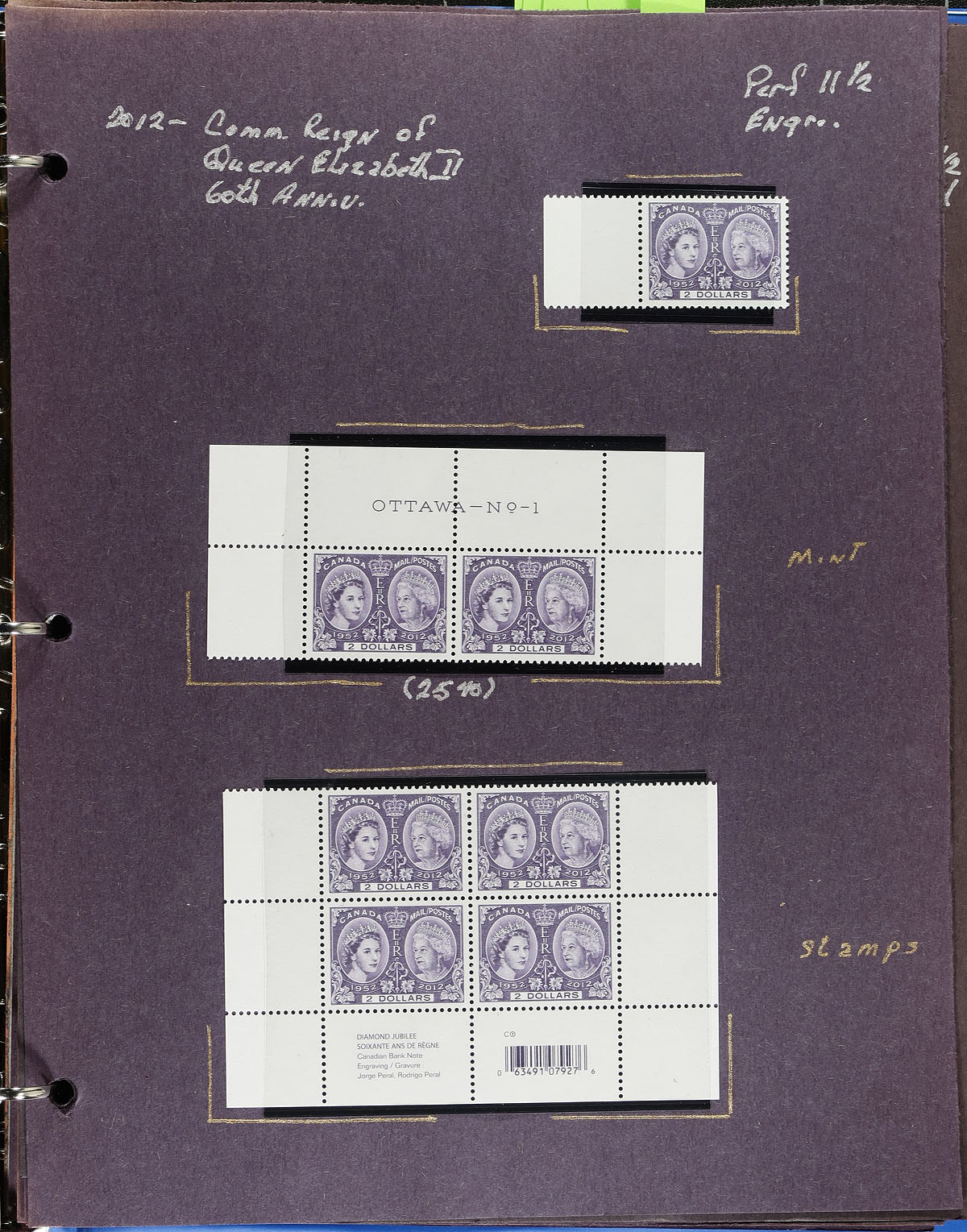 Lovely collection of primarily mint never hinged Canada, May 2012, covering Unitrade #s 2539-2548, all in hingeless mounts in roughly 30 well described pages housed in a binder. The collection contains mint and used singles, souvenir sheets (mint and used), sheetlets, booklets, and a few first day covers. We note a few items cataloguing $10.00 and up. Face value alone totals $176.00 (including 118x "P" stamps). A nice group for all collectors. 2024 Unitrade =