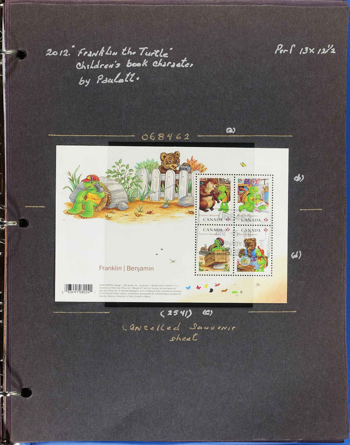 Lovely collection of primarily mint never hinged Canada, May 2012, covering Unitrade #s 2539-2548, all in hingeless mounts in roughly 30 well described pages housed in a binder. The collection contains mint and used singles, souvenir sheets (mint and used), sheetlets, booklets, and a few first day covers. We note a few items cataloguing $10.00 and up. Face value alone totals $176.00 (including 118x "P" stamps). A nice group for all collectors. 2024 Unitrade =