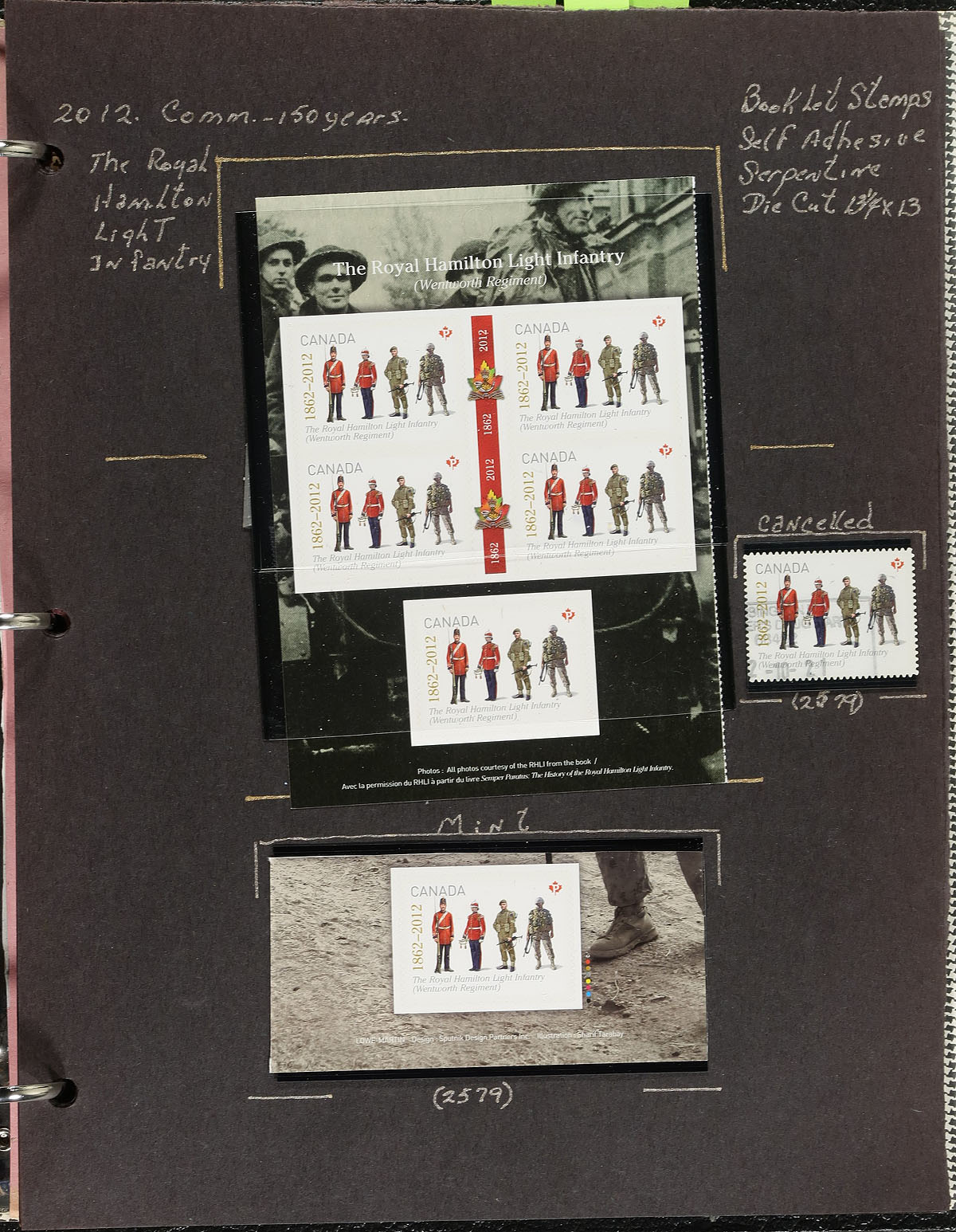 Lovely collection of primarily mint never hinged Canada, from June, October of 2012, covering Unitrade #s 2554-2555, 2577-2580, all in hingeless mounts in over 20 well described pages housed in a binder. The collection contains mint and used singles, sheetlets, matched set of plate blocks, souvenir sheets, booklets, and a few first day covers. We note a few items cataloguing $10.00 and up. Face value alone totals $183.00 (including 148x "P" stamps). A nice group for all collectors. 2024 Unitrade =