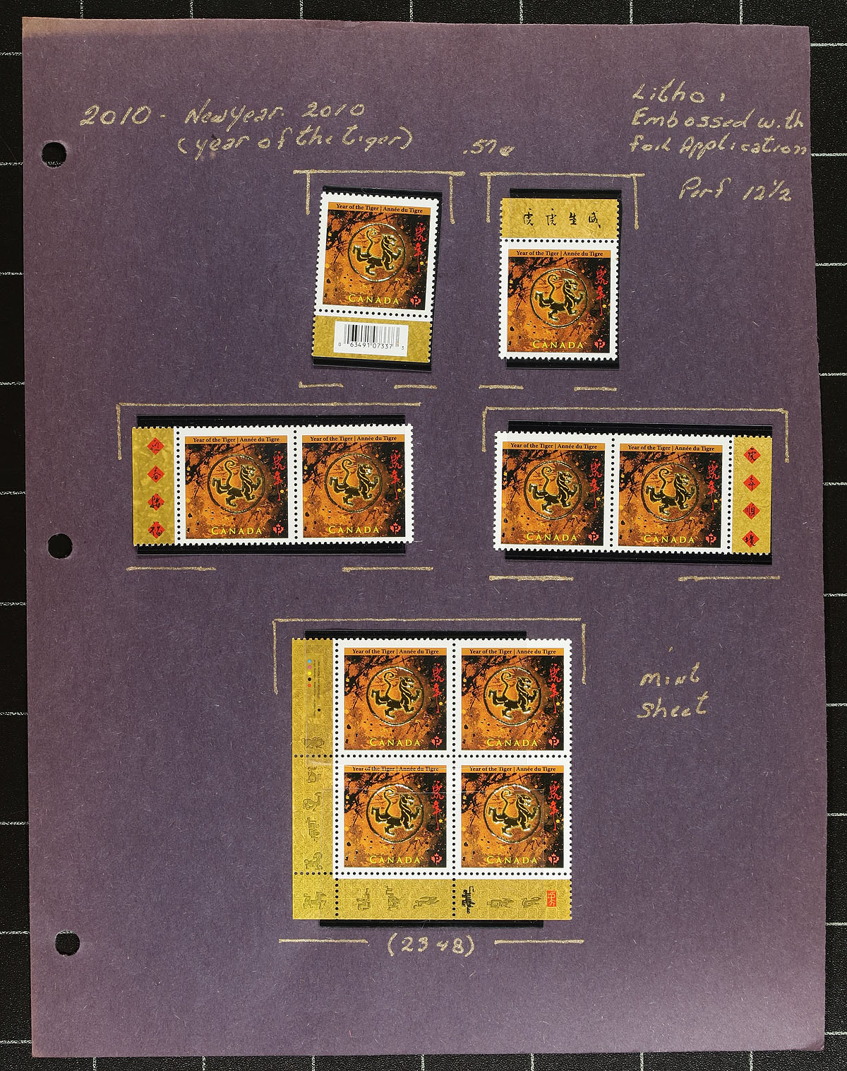 Lovely collection of primarily mint never hinged "Lunar New Year- Year of the Tiger", January 2010, Covering Unitrade #s 2348-2349, all in hingeless mounts in 19 well described pages. The collection contains mint and used singles, 2 mint sheets, matched set of mint and used plate blocks, mint and used souvenir sheets, and a few official first day covers. Face value alone totals $95.00 (includes 77x "P" stamps). A lovely collection for any Canada collector. 2024 Unitrade =