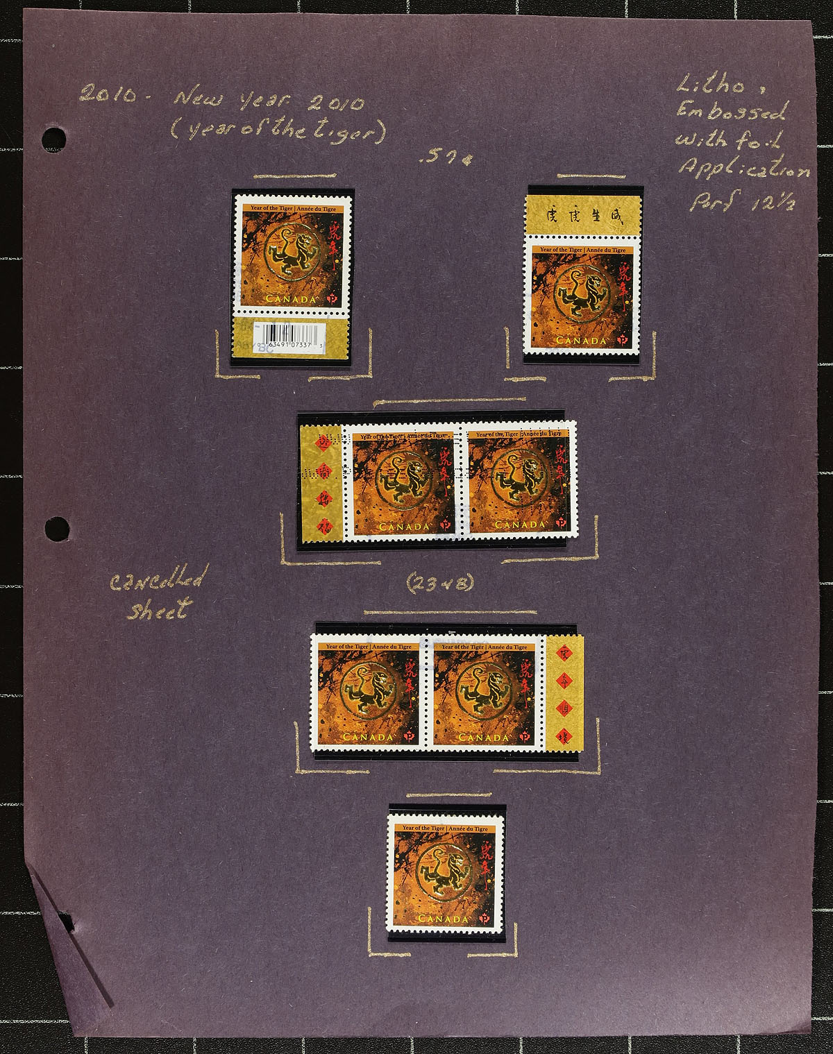 Lovely collection of primarily mint never hinged "Lunar New Year- Year of the Tiger", January 2010, Covering Unitrade #s 2348-2349, all in hingeless mounts in 19 well described pages. The collection contains mint and used singles, 2 mint sheets, matched set of mint and used plate blocks, mint and used souvenir sheets, and a few official first day covers. Face value alone totals $95.00 (includes 77x "P" stamps). A lovely collection for any Canada collector. 2024 Unitrade =