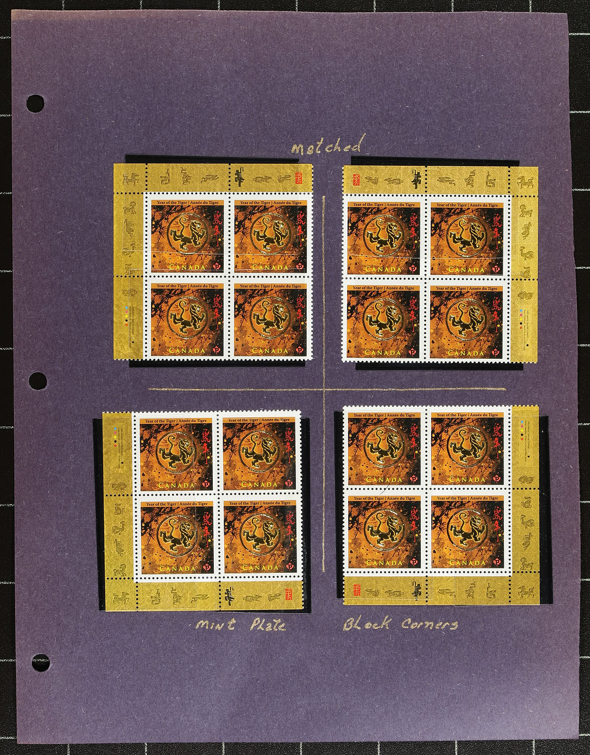 Lovely collection of primarily mint never hinged "Lunar New Year- Year of the Tiger", January 2010, Covering Unitrade #s 2348-2349, all in hingeless mounts in 19 well described pages. The collection contains mint and used singles, 2 mint sheets, matched set of mint and used plate blocks, mint and used souvenir sheets, and a few official first day covers. Face value alone totals $95.00 (includes 77x "P" stamps). A lovely collection for any Canada collector. 2024 Unitrade =