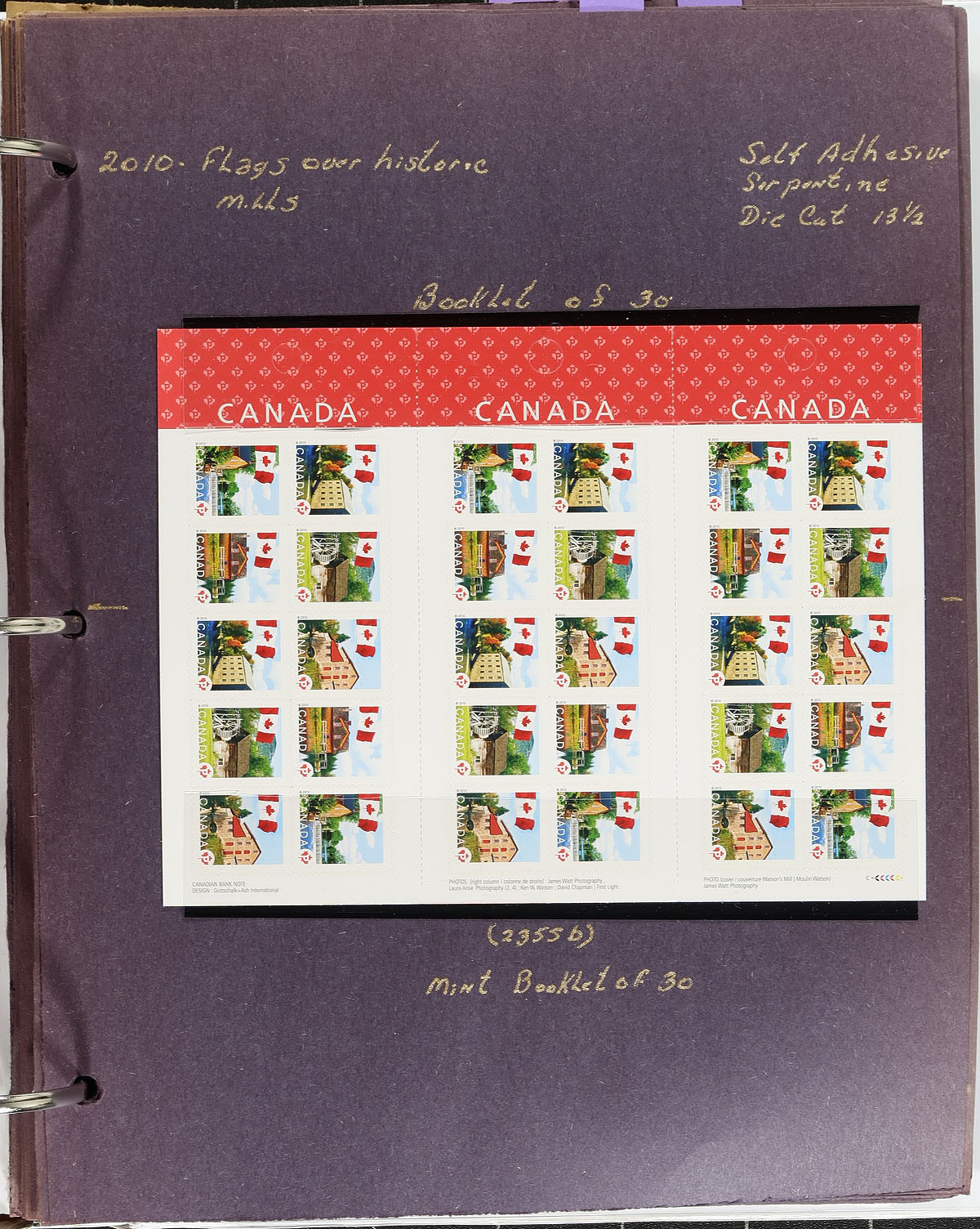 Attractive collection of primarily mint never hinged "Flower" and First Class defintives, January 2010, covering Unitrade #s 2350-2365, all in hingeless mounts in over 20 well described pages, housed in a binder. The collection contains mint and used singles (including booklet stamps), coil singles, pairs, and strips of 4, booklets, souvenir sheets (mint and used), and roughly 30 first day covers (most having Lower Mainland and Vancouver postmarks from several different outlets). We note a few items cataloguing $15.00 and up. Face value alone totals $224.00 (including 89x "P" stamps). A nice collection that would be difficult to duplicate. 2024 Unitrade =