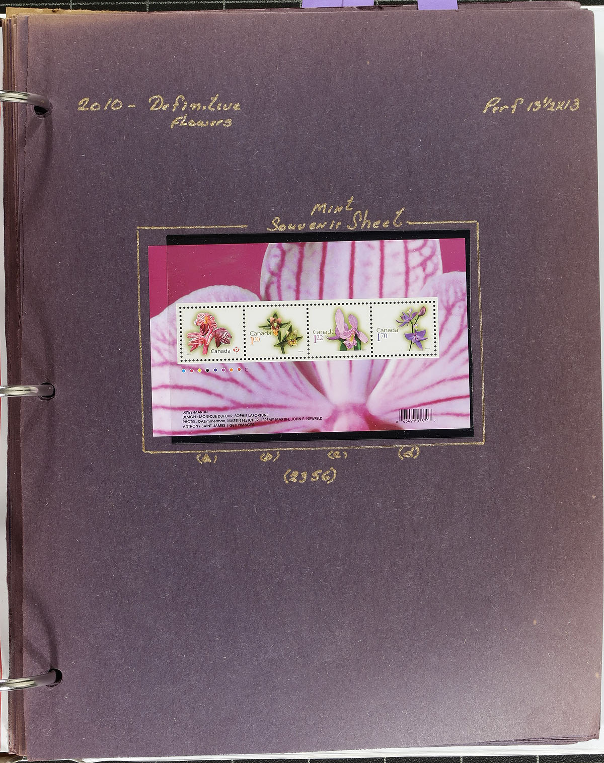 Attractive collection of primarily mint never hinged "Flower" and First Class defintives, January 2010, covering Unitrade #s 2350-2365, all in hingeless mounts in over 20 well described pages, housed in a binder. The collection contains mint and used singles (including booklet stamps), coil singles, pairs, and strips of 4, booklets, souvenir sheets (mint and used), and roughly 30 first day covers (most having Lower Mainland and Vancouver postmarks from several different outlets). We note a few items cataloguing $15.00 and up. Face value alone totals $224.00 (including 89x "P" stamps). A nice collection that would be difficult to duplicate. 2024 Unitrade =