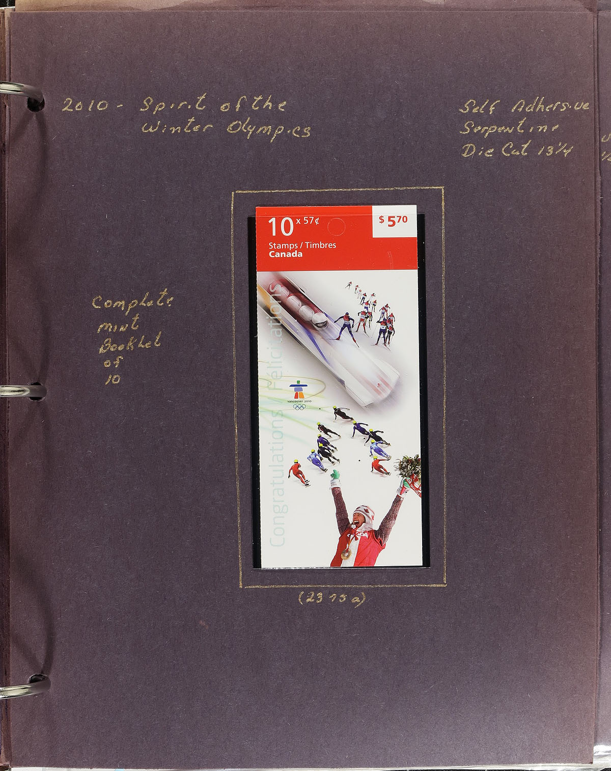 In-depth collection of primarily mint never hinged Canada, from January to May of 2010, covering Unitrade #s 2366-2386, all in hingeless mounts in over 50 well described pages, housed in a binder. The collection contains mint and used singles (including booklet stamps), multiples, matched set of plate blocks (including used sets), for some issues, along with a few souvenir sheets and sheetlets, booklets, and first day covers. We note some match sets cataloguing $10 and up, with a Unitrade 2024 catalogue value for the collection totaling $484. Duplication up to 1 for a few issues. Face value alone totals $221 (including 24x "P" stamps, counted at $1.24 each). A nice comprehensive collection that would be difficult to duplicate.