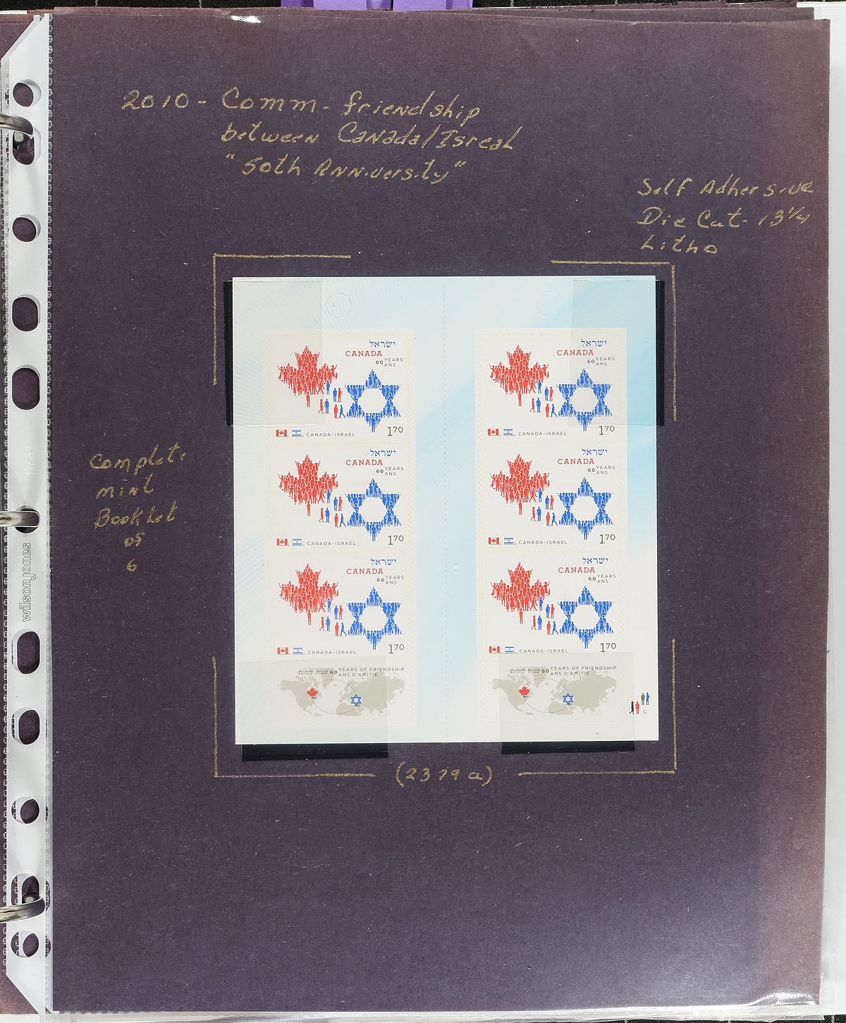 In-depth collection of primarily mint never hinged Canada, from January to May of 2010, covering Unitrade #s 2366-2386, all in hingeless mounts in over 50 well described pages, housed in a binder. The collection contains mint and used singles (including booklet stamps), multiples, matched set of plate blocks (including used sets), for some issues, along with a few souvenir sheets and sheetlets, booklets, and first day covers. We note some match sets cataloguing $10 and up, with a Unitrade 2024 catalogue value for the collection totaling $484. Duplication up to 1 for a few issues. Face value alone totals $221 (including 24x "P" stamps, counted at $1.24 each). A nice comprehensive collection that would be difficult to duplicate.