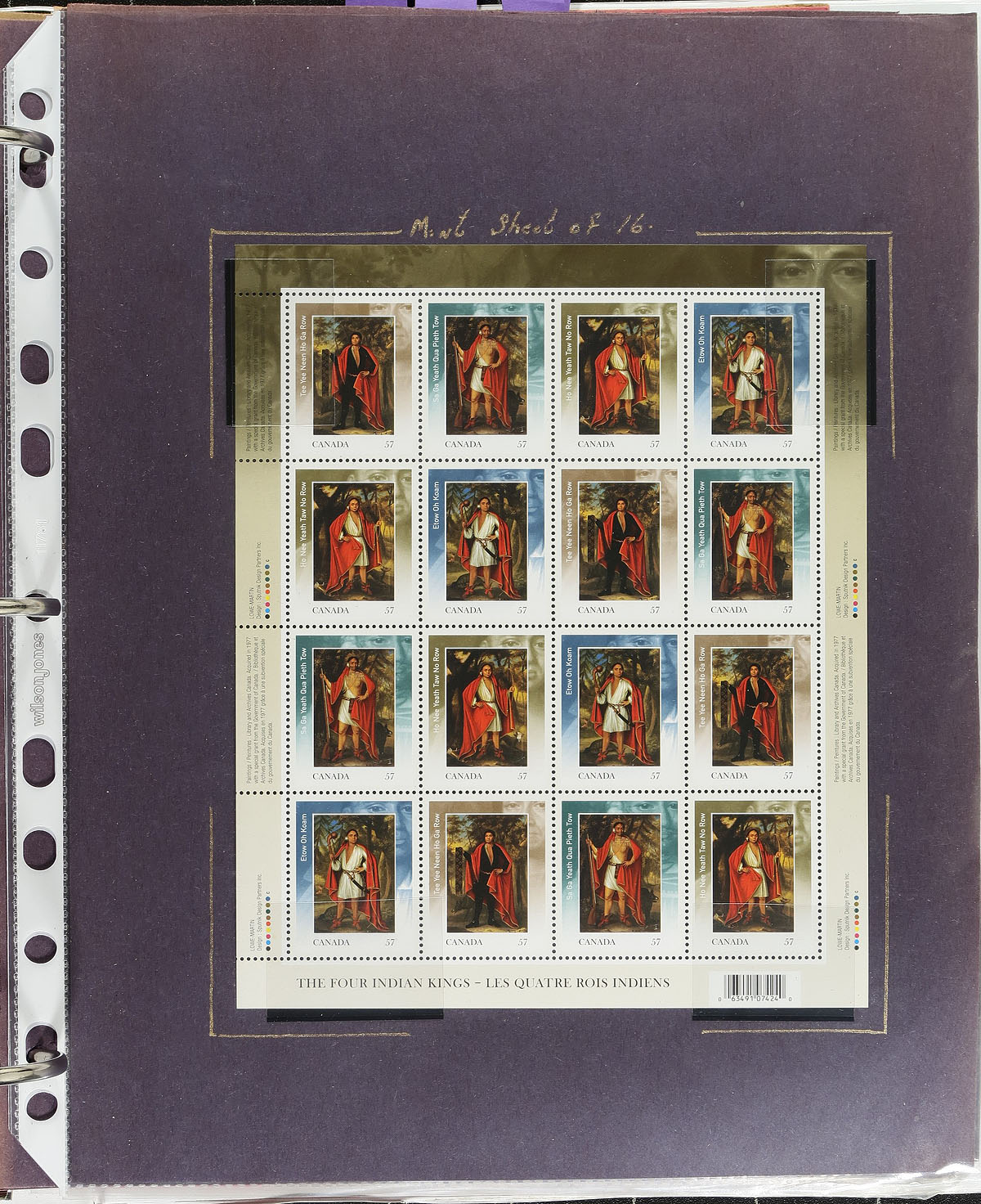 In-depth collection of primarily mint never hinged Canada, from January to May of 2010, covering Unitrade #s 2366-2386, all in hingeless mounts in over 50 well described pages, housed in a binder. The collection contains mint and used singles (including booklet stamps), multiples, matched set of plate blocks (including used sets), for some issues, along with a few souvenir sheets and sheetlets, booklets, and first day covers. We note some match sets cataloguing $10 and up, with a Unitrade 2024 catalogue value for the collection totaling $484. Duplication up to 1 for a few issues. Face value alone totals $221 (including 24x "P" stamps, counted at $1.24 each). A nice comprehensive collection that would be difficult to duplicate.