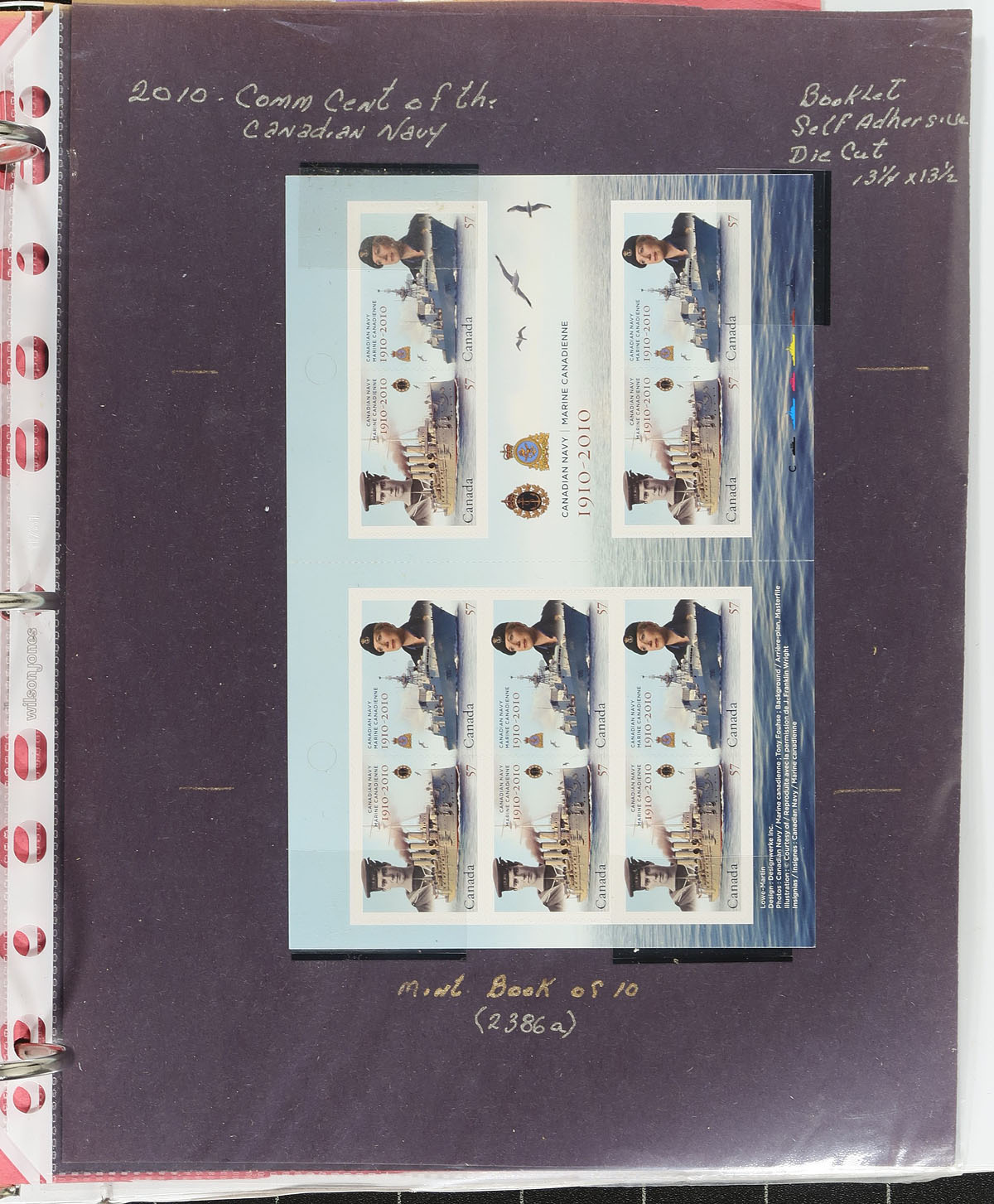 In-depth collection of primarily mint never hinged Canada, from January to May of 2010, covering Unitrade #s 2366-2386, all in hingeless mounts in over 50 well described pages, housed in a binder. The collection contains mint and used singles (including booklet stamps), multiples, matched set of plate blocks (including used sets), for some issues, along with a few souvenir sheets and sheetlets, booklets, and first day covers. We note some match sets cataloguing $10 and up, with a Unitrade 2024 catalogue value for the collection totaling $484. Duplication up to 1 for a few issues. Face value alone totals $221 (including 24x "P" stamps, counted at $1.24 each). A nice comprehensive collection that would be difficult to duplicate.