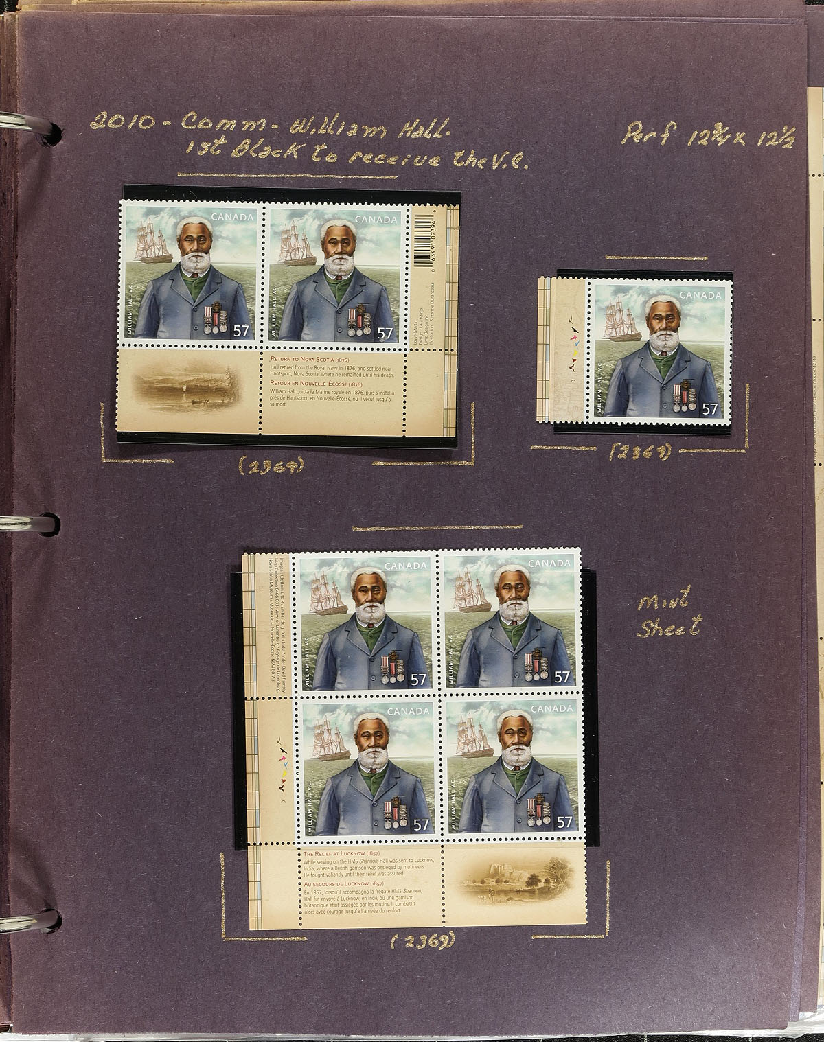 In-depth collection of primarily mint never hinged Canada, from January to May of 2010, covering Unitrade #s 2366-2386, all in hingeless mounts in over 50 well described pages, housed in a binder. The collection contains mint and used singles (including booklet stamps), multiples, matched set of plate blocks (including used sets), for some issues, along with a few souvenir sheets and sheetlets, booklets, and first day covers. We note some match sets cataloguing $10 and up, with a Unitrade 2024 catalogue value for the collection totaling $484. Duplication up to 1 for a few issues. Face value alone totals $221 (including 24x "P" stamps, counted at $1.24 each). A nice comprehensive collection that would be difficult to duplicate.