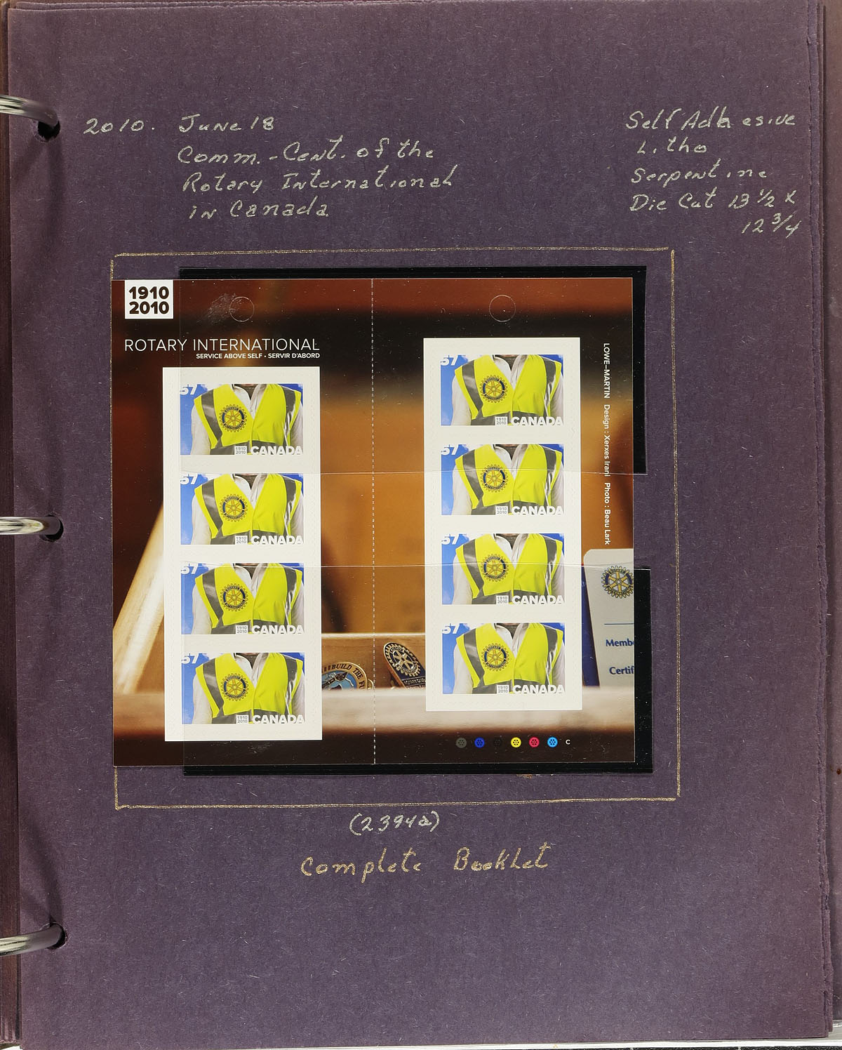 In-depth collection of primarily mint never hinged Canada, from May to September of 2010, covering Unitrade #s 2387-2404, all in hingeless mounts in over 50 well described pages, housed in a binder. The collection contains mint and used singles (including booklet stamps), multiples, matched set of plate blocks (including used sets), for some issues, along with a few souvenir sheets and sheetlets, booklets, and first day covers. We note some match sets cataloguing $10.00 and up. Face value alone totals $231.00 (including 46x "P" stamps). A nice comprehensive collection that would be difficult to duplicate. 2024 Unitrade =