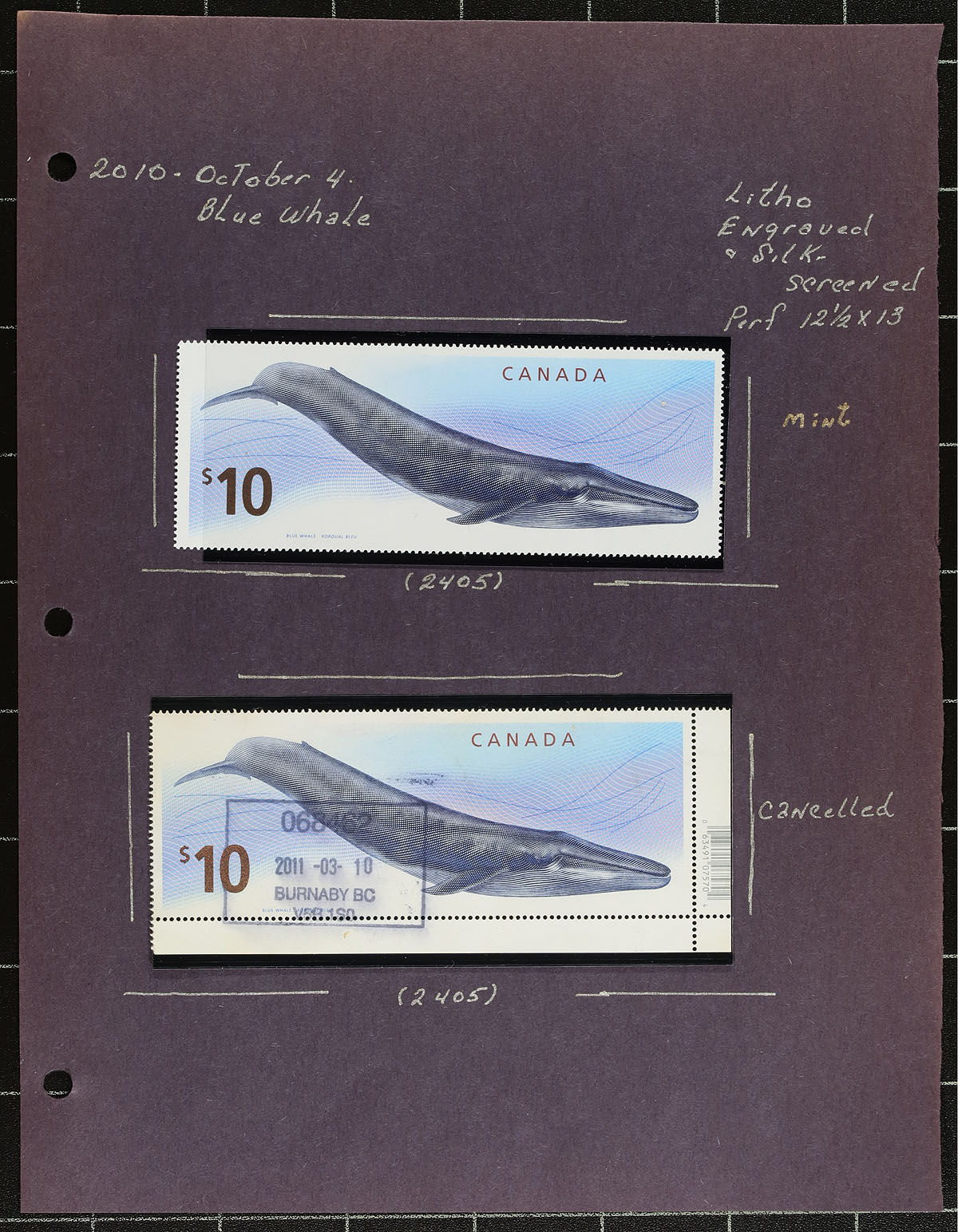 Nice lot of high value "Wildlife Blue Whale" definitive, October 2010, Unitrade #2405, containing 3 mint singles, 2 used singles, mint souvenir sheet, and a first day cover, all in hingeless mounts on a few well described pages. A nice lot of these ever popular issues. 2024 Unitrade =
