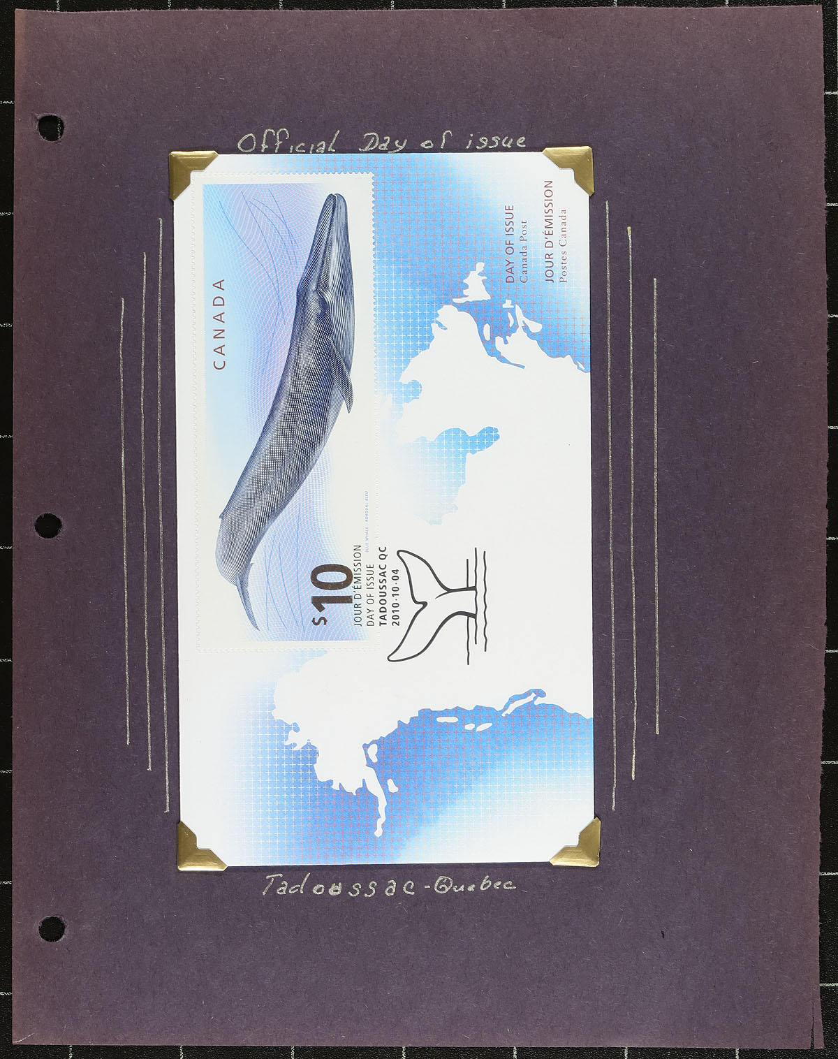 Nice lot of high value "Wildlife Blue Whale" definitive, October 2010, Unitrade #2405, containing 3 mint singles, 2 used singles, mint souvenir sheet, and a first day cover, all in hingeless mounts on a few well described pages. A nice lot of these ever popular issues. 2024 Unitrade =