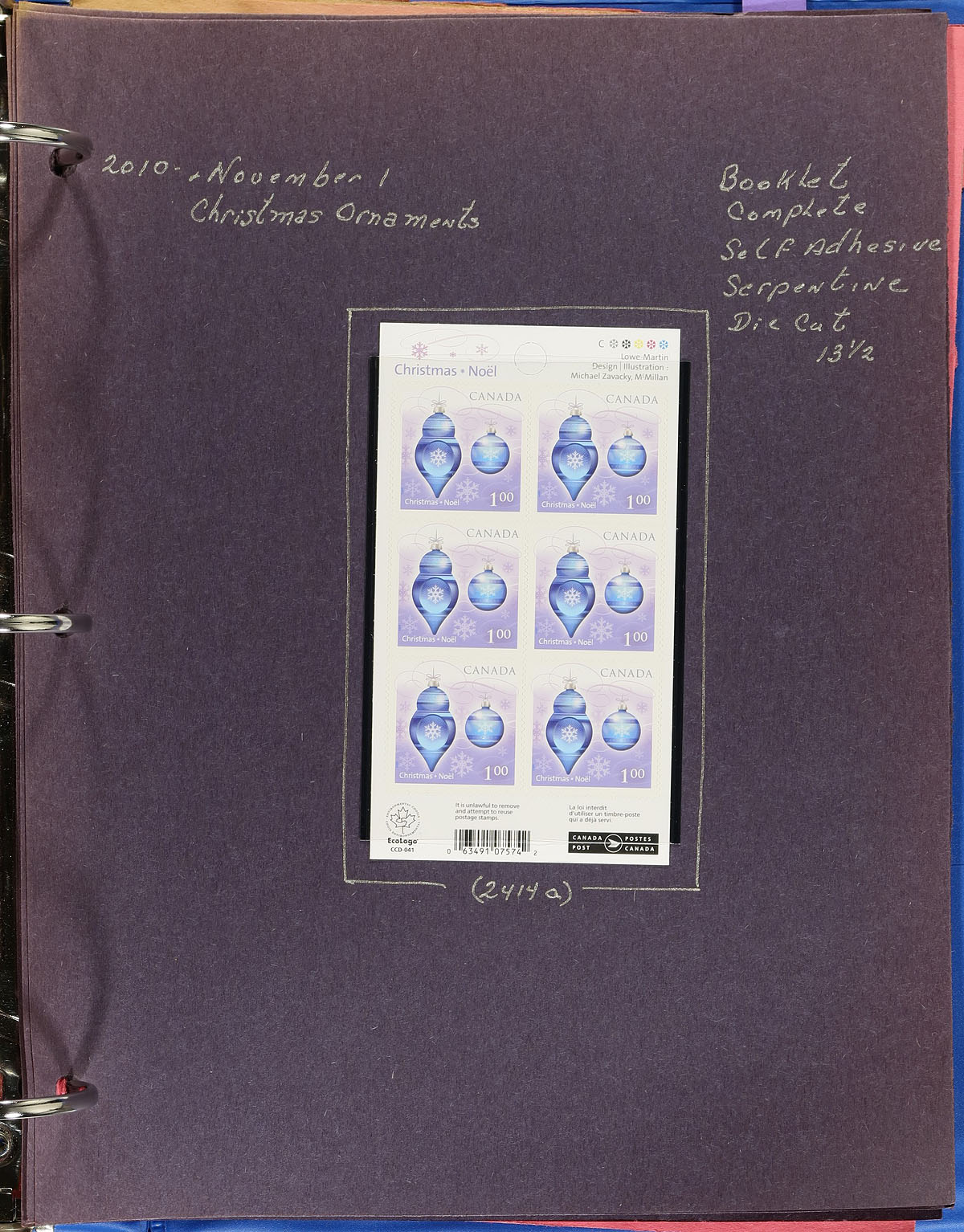In-depth collection of primarily mint never hinged low value "Beneficial Insects" definitives and "Christmas" issues, October to November of 2010, covering Unitrade #s 2406-2415, all in hingeless mounts in over 50 well described pages, housed in a binder. The collection contains a mint and used singles (including booklet stamps), multiples, matched set of plate blocks (mint and used), for most issues, along with sheetlets, booklets, and first day covers. Face value alone totals $150.00 (including 53x "P" stamps). A nice collection that would be difficult to duplicate. 2024 Unitrade =