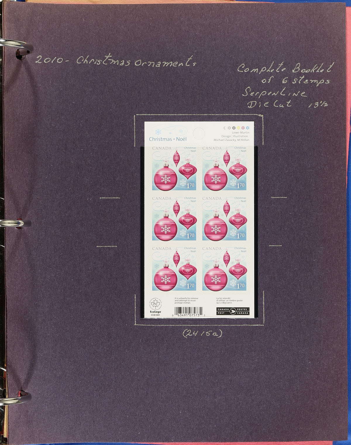 In-depth collection of primarily mint never hinged low value "Beneficial Insects" definitives and "Christmas" issues, October to November of 2010, covering Unitrade #s 2406-2415, all in hingeless mounts in over 50 well described pages, housed in a binder. The collection contains a mint and used singles (including booklet stamps), multiples, matched set of plate blocks (mint and used), for most issues, along with sheetlets, booklets, and first day covers. Face value alone totals $150.00 (including 53x "P" stamps). A nice collection that would be difficult to duplicate. 2024 Unitrade =