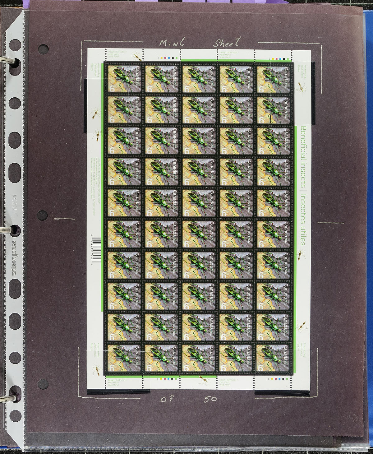 In-depth collection of primarily mint never hinged low value "Beneficial Insects" definitives and "Christmas" issues, October to November of 2010, covering Unitrade #s 2406-2415, all in hingeless mounts in over 50 well described pages, housed in a binder. The collection contains a mint and used singles (including booklet stamps), multiples, matched set of plate blocks (mint and used), for most issues, along with sheetlets, booklets, and first day covers. Face value alone totals $150.00 (including 53x "P" stamps). A nice collection that would be difficult to duplicate. 2024 Unitrade =
