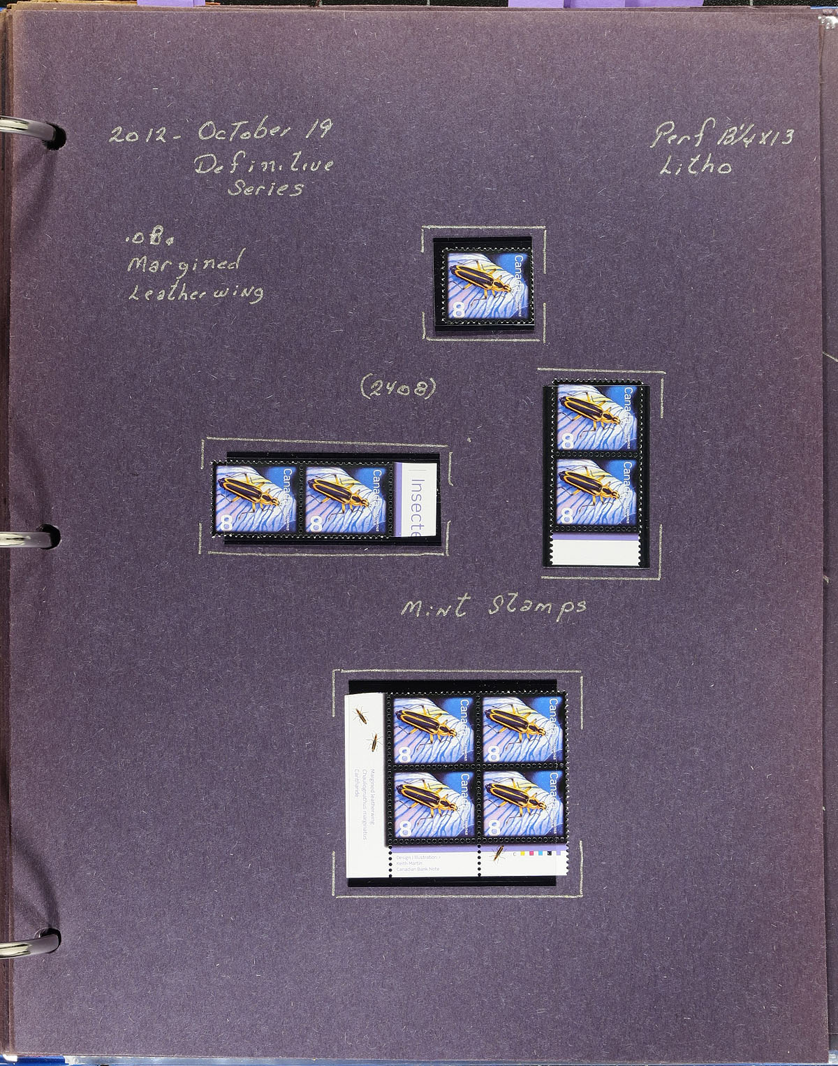 In-depth collection of primarily mint never hinged low value "Beneficial Insects" definitives and "Christmas" issues, October to November of 2010, covering Unitrade #s 2406-2415, all in hingeless mounts in over 50 well described pages, housed in a binder. The collection contains a mint and used singles (including booklet stamps), multiples, matched set of plate blocks (mint and used), for most issues, along with sheetlets, booklets, and first day covers. Face value alone totals $150.00 (including 53x "P" stamps). A nice collection that would be difficult to duplicate. 2024 Unitrade =