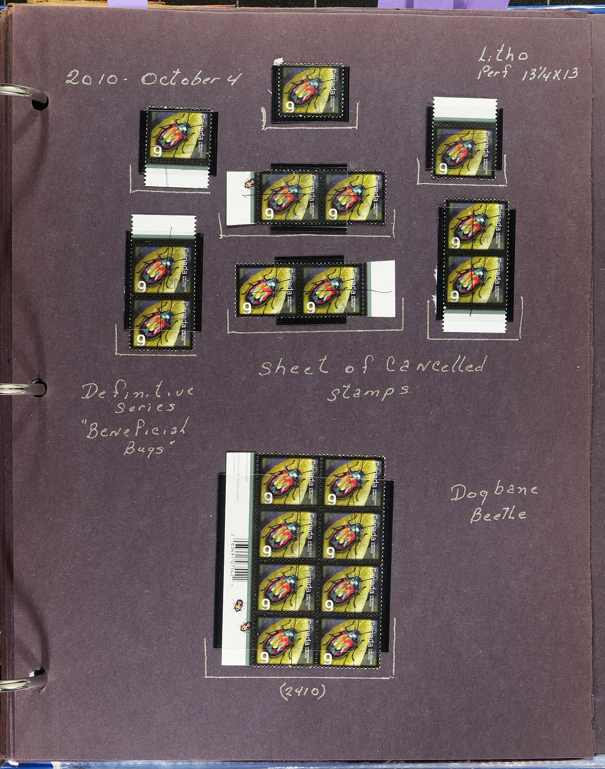 In-depth collection of primarily mint never hinged low value "Beneficial Insects" definitives and "Christmas" issues, October to November of 2010, covering Unitrade #s 2406-2415, all in hingeless mounts in over 50 well described pages, housed in a binder. The collection contains a mint and used singles (including booklet stamps), multiples, matched set of plate blocks (mint and used), for most issues, along with sheetlets, booklets, and first day covers. Face value alone totals $150.00 (including 53x "P" stamps). A nice collection that would be difficult to duplicate. 2024 Unitrade =