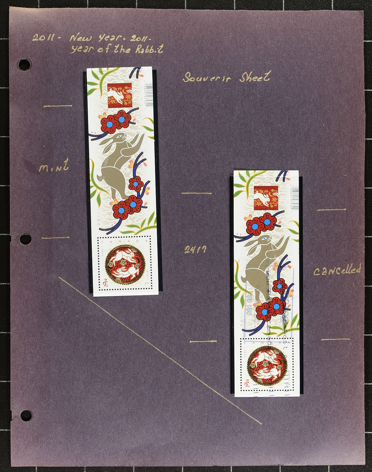 Lovely collection of primarily mint never hinged "Lunar New Year- Year of the Rabbit", January 2011, Covering Unitrade #s 2416-2417, all in hingeless mounts in 17 well described pages. The collection contains mint and used singles, 2 mint sheets, matched set of mint and used plate blocks, mint and used souvenir sheets, and 8 first day covers (most having Lower Mainland B.C. post offices). Face value alone totals $104 (includes 83x "P" stamps). A lovely collection for any Canada collector. 2024 Unitrade =
