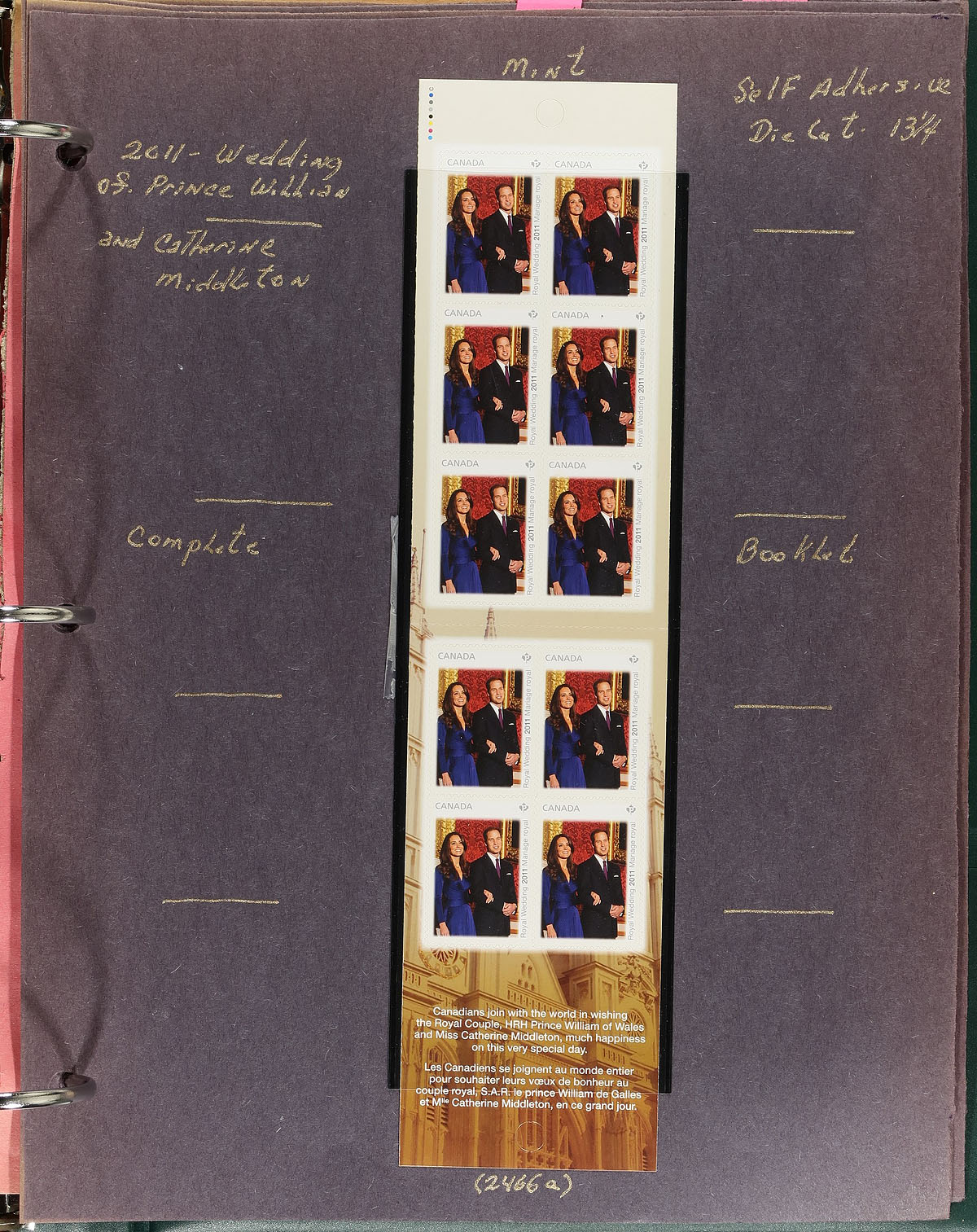 Lovely collection of primarily mint never hinged Canada, from April of 2011, covering Unitrade #s 2461-2467, all in hingeless mounts in over 15 well described pages, housed in a binder. The collection contains mint and used singles (including booklet stamps), matched set of plate blocks (including used sets), along with a few souvenir sheets and sheetlets, booklets, and first day covers. We note some items cataloguing $10.00 and up. Face value alone totals $200.00 (including 83x "P" stamps). A nice lot for all collectors. 2024 Unitrade =