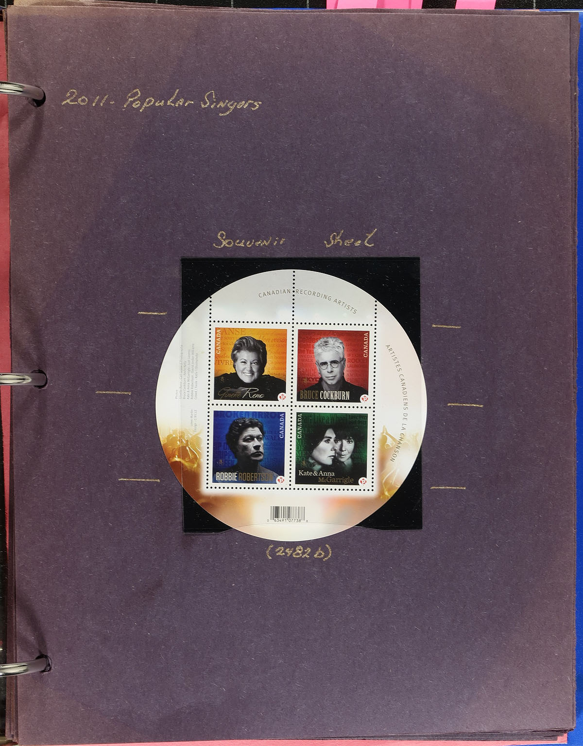 Lovely collection of primarily mint never hinged Canada, from June to October of 2011, covering Unitrade #s 2482b-2489, all in hingeless mounts in over 15 well described pages housed in a binder. The collection contains mint a few souvenir sheets, booklets and panes, and a few first day covers. We note some items cataloguing $10.00 and up. Face value alone totals $164.00 (including 122x "P" stamps). A nice lot for all collectors. 2024 Unitrade =