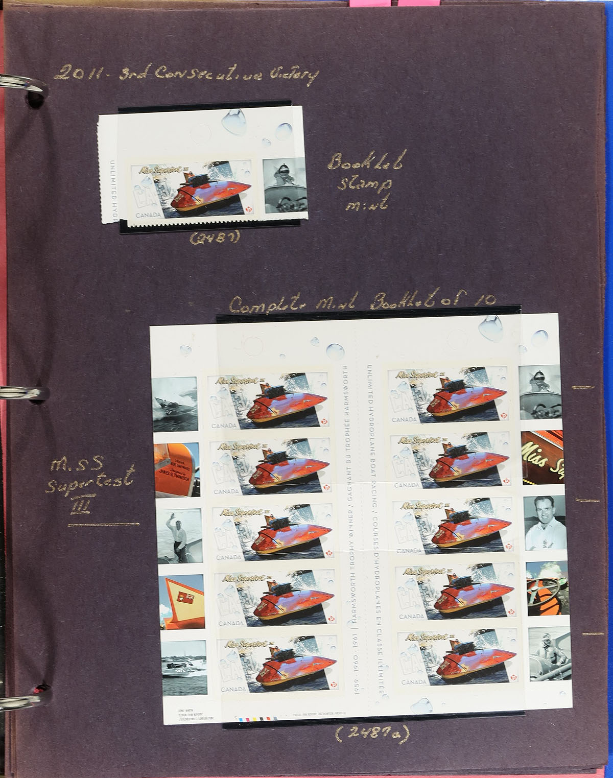 Lovely collection of primarily mint never hinged Canada, from June to October of 2011, covering Unitrade #s 2482b-2489, all in hingeless mounts in over 15 well described pages housed in a binder. The collection contains mint a few souvenir sheets, booklets and panes, and a few first day covers. We note some items cataloguing $10.00 and up. Face value alone totals $164.00 (including 122x "P" stamps). A nice lot for all collectors. 2024 Unitrade =