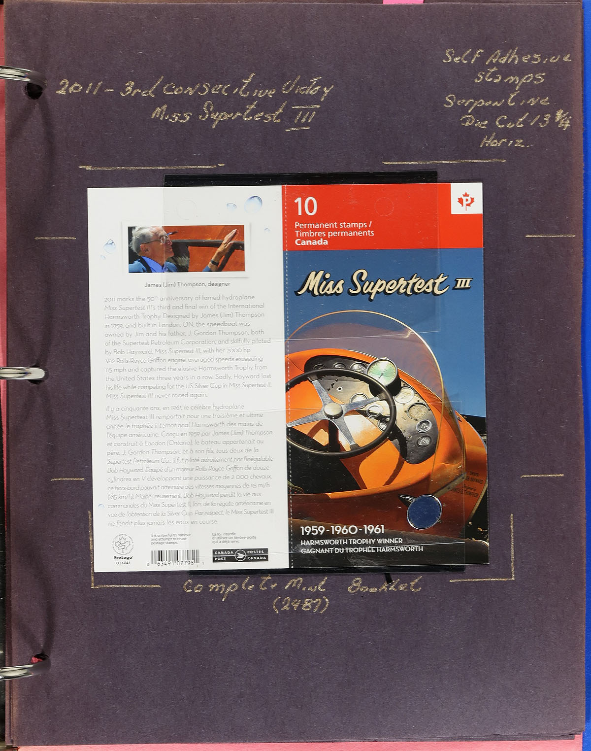 Lovely collection of primarily mint never hinged Canada, from June to October of 2011, covering Unitrade #s 2482b-2489, all in hingeless mounts in over 15 well described pages housed in a binder. The collection contains mint a few souvenir sheets, booklets and panes, and a few first day covers. We note some items cataloguing $10.00 and up. Face value alone totals $164.00 (including 122x "P" stamps). A nice lot for all collectors. 2024 Unitrade =