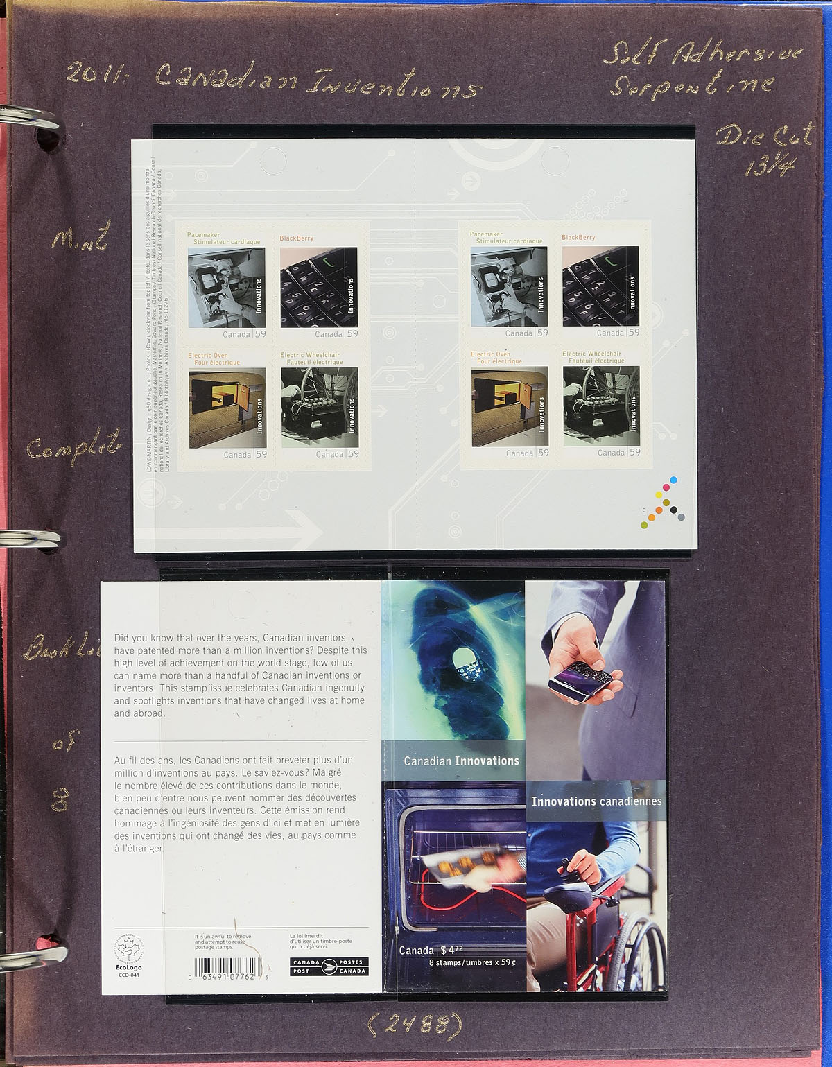 Lovely collection of primarily mint never hinged Canada, from June to October of 2011, covering Unitrade #s 2482b-2489, all in hingeless mounts in over 15 well described pages housed in a binder. The collection contains mint a few souvenir sheets, booklets and panes, and a few first day covers. We note some items cataloguing $10.00 and up. Face value alone totals $164.00 (including 122x "P" stamps). A nice lot for all collectors. 2024 Unitrade =