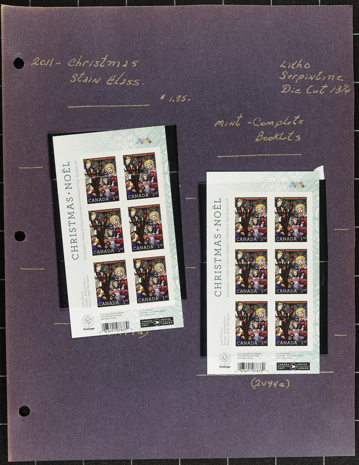 Collection of primarily mint never hinged "Christmas" issues, from November 2011, covering Unitrade #s 2490-2494, all in hingeless mounts in 11 well described pages. The collection contains mint and used singles, along with a few mint and used souvenir sheets, booklets, and first day covers. We note some items cataloguing $10.00 and up. Face value alone totals $108.00 (including 54x "P" stamps). A nice lot for all collectors. 2024 Unitrade =