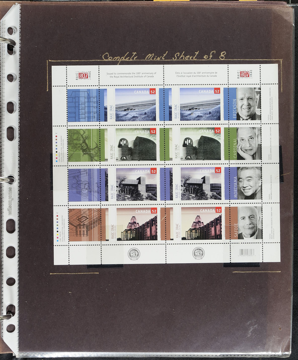 In-depth collection of primarily mint never hinged Canada, from January to June of 2007, covering Unitrade #s 2201-2200, all in hingeless mounts in over 50 well described pages, housed in a thick binder. The collection contains mint and used singles (including booklet stamps), multiples, matched set of plate blocks (including used sets), for some issues, along with a few souvenir sheets and sheetlets (mint and used), booklets (including used booklet panes), and first day covers. We note several match sets cataloguing $10 and up. Face value alone totals $186.00. A nice comprehensive collection that would be difficult to duplicate. 2024 Unitrade =