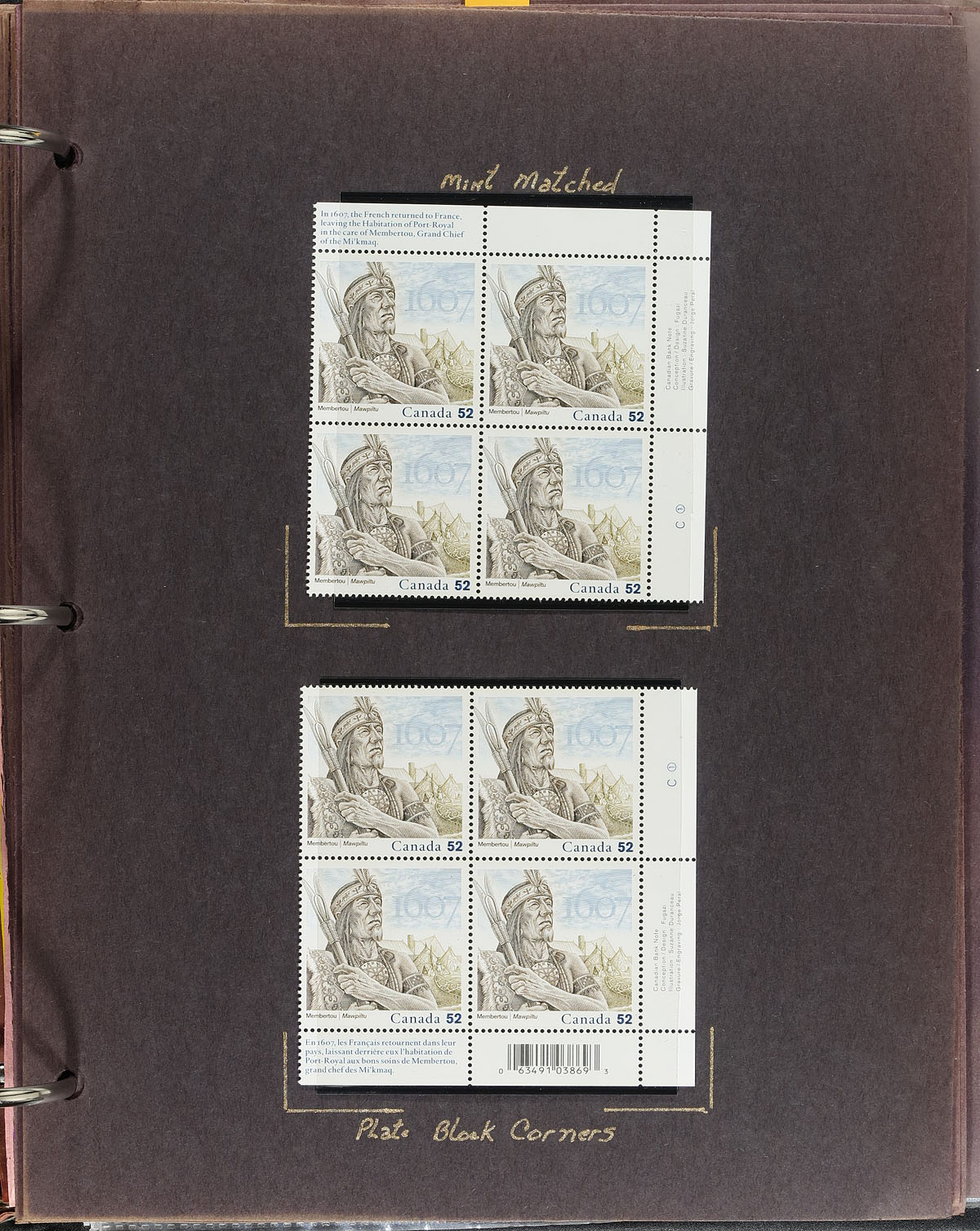 In-depth collection of primarily mint never hinged Canada, from June to October of 2007, covering Unitrade #s 2221-2233, all in hingeless mounts in over 50 well described pages, housed in a binder. The collection contains mint and used singles (including booklet stamps), multiples, matched set of plate blocks (including used sets), for some issues, along with a few souvenir sheets and sheetlets (mint and used), booklets (including used booklet panes), and first day covers. We note several match sets cataloguing $10 and up. Face value alone totals $124.00. A nice comprehensive collection that would be difficult to duplicate. 2024 Unitrade =