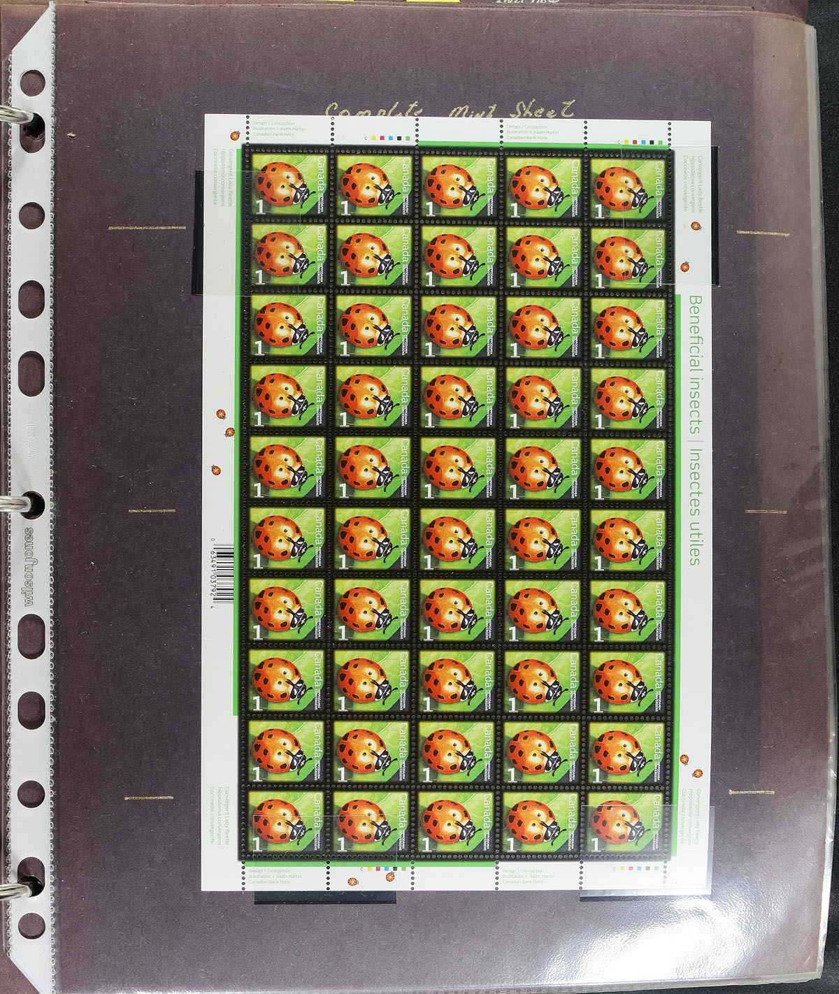 In-depth collection of primarily mint never hinged low value "Beneficial Insects" definitives, October 2007, covering Unitrade #s 2234-2238, all in hingeless mounts in over 50 well described pages, housed in a binder. The collection contains a mint and used singles (including booklet stamps), multiples, matched set of plate blocks (mint and used), for most issues, sheetlets (mint and a few used), and first day covers. Face value alone totals $101.00. A lovely collection of these popular issues. 2024 Unitrade =