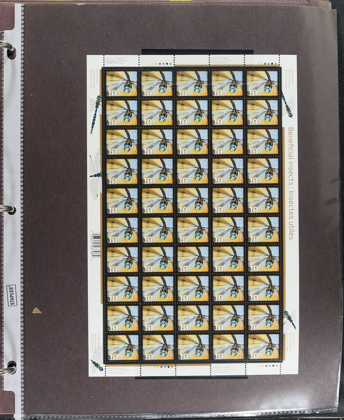 In-depth collection of primarily mint never hinged low value "Beneficial Insects" definitives, October 2007, covering Unitrade #s 2234-2238, all in hingeless mounts in over 50 well described pages, housed in a binder. The collection contains a mint and used singles (including booklet stamps), multiples, matched set of plate blocks (mint and used), for most issues, sheetlets (mint and a few used), and first day covers. Face value alone totals $101.00. A lovely collection of these popular issues. 2024 Unitrade =