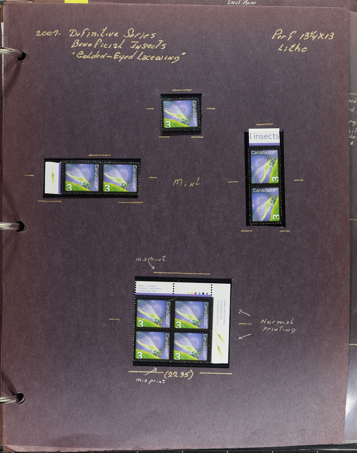 In-depth collection of primarily mint never hinged low value "Beneficial Insects" definitives, October 2007, covering Unitrade #s 2234-2238, all in hingeless mounts in over 50 well described pages, housed in a binder. The collection contains a mint and used singles (including booklet stamps), multiples, matched set of plate blocks (mint and used), for most issues, sheetlets (mint and a few used), and first day covers. Face value alone totals $101.00. A lovely collection of these popular issues. 2024 Unitrade =