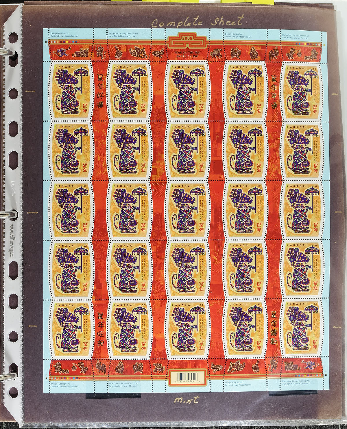 Collection of primarily mint never hinged Canada, from January to May of 2008, covering Unitrade #s 2257-2273, all in hingeless mounts in over 50 well described pages, housed in a thick binder. The collection contains mint and used singles (including booklet stamps), multiples, matched set of plate blocks (including used sets), for some issues, along with a few souvenir sheets and sheetlets (mint and a few used), booklets, and first day covers. We note several match sets cataloguing $10.00 and up. Face value alone totals $181.00. A nice comprehensive collection that would be difficult to duplicate. 2024 Unitrade =