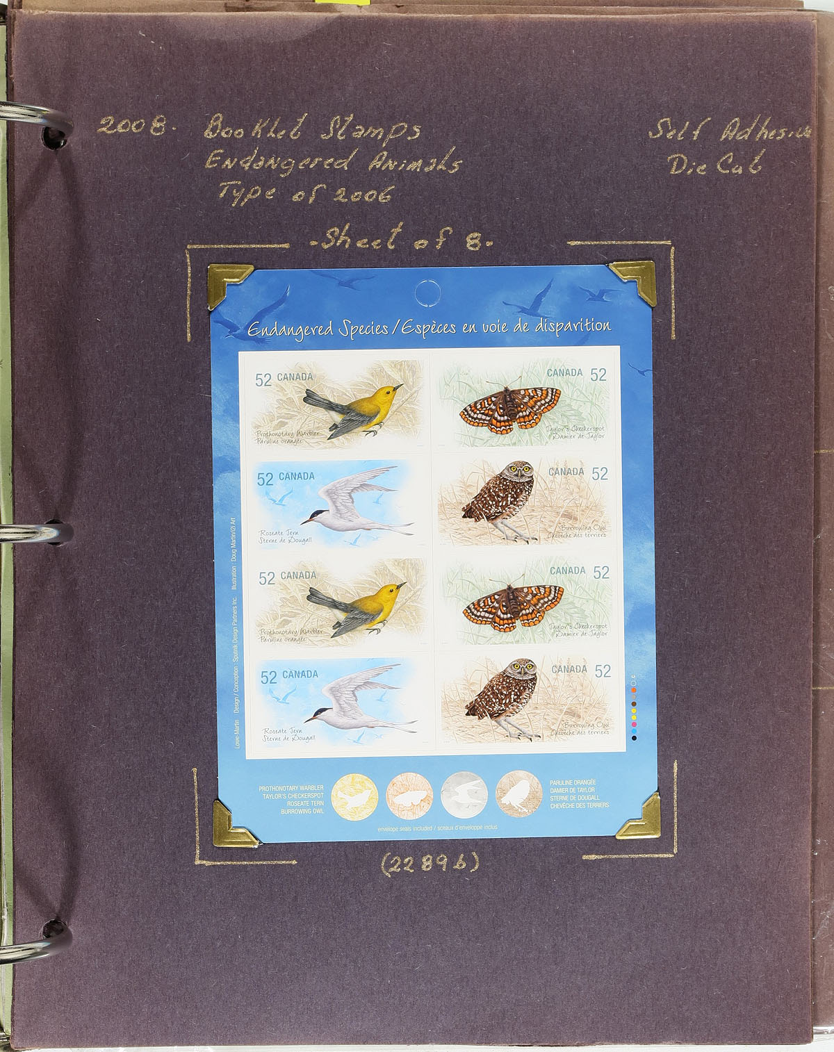 Collection of primarily mint never hinged Canada, from June to October of 2008, covering Unitrade #s 2274-2290, all in hingeless mounts in over 50 well described pages, housed in a thick binder. The collection contains mint and used singles (including booklet stamps), multiples, matched set of plate blocks (including used sets), for some issues, along with a few souvenir sheets and sheetlets (mint and a few used), booklets, and first day covers. We note several match sets cataloguing $10.00 and up. Face value alone totals $193.00. A nice comprehensive collection that would be difficult to duplicate. 2024 Unitrade =