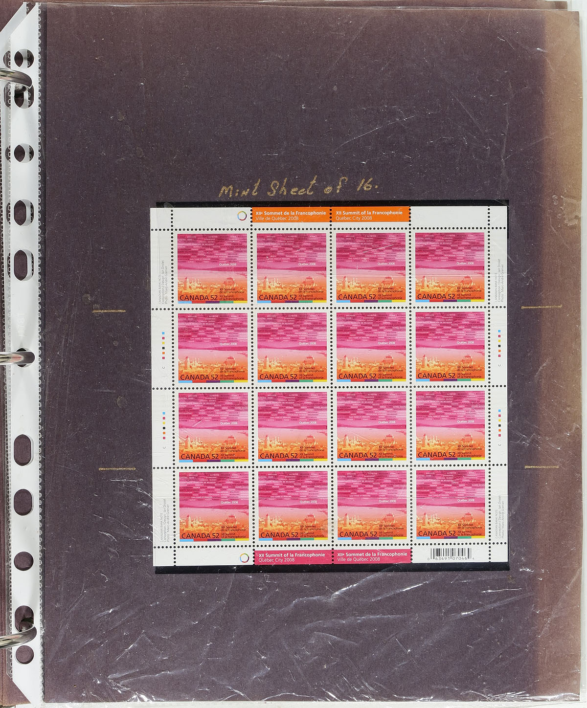 Collection of primarily mint never hinged Canada, from June to October of 2008, covering Unitrade #s 2274-2290, all in hingeless mounts in over 50 well described pages, housed in a thick binder. The collection contains mint and used singles (including booklet stamps), multiples, matched set of plate blocks (including used sets), for some issues, along with a few souvenir sheets and sheetlets (mint and a few used), booklets, and first day covers. We note several match sets cataloguing $10.00 and up. Face value alone totals $193.00. A nice comprehensive collection that would be difficult to duplicate. 2024 Unitrade =