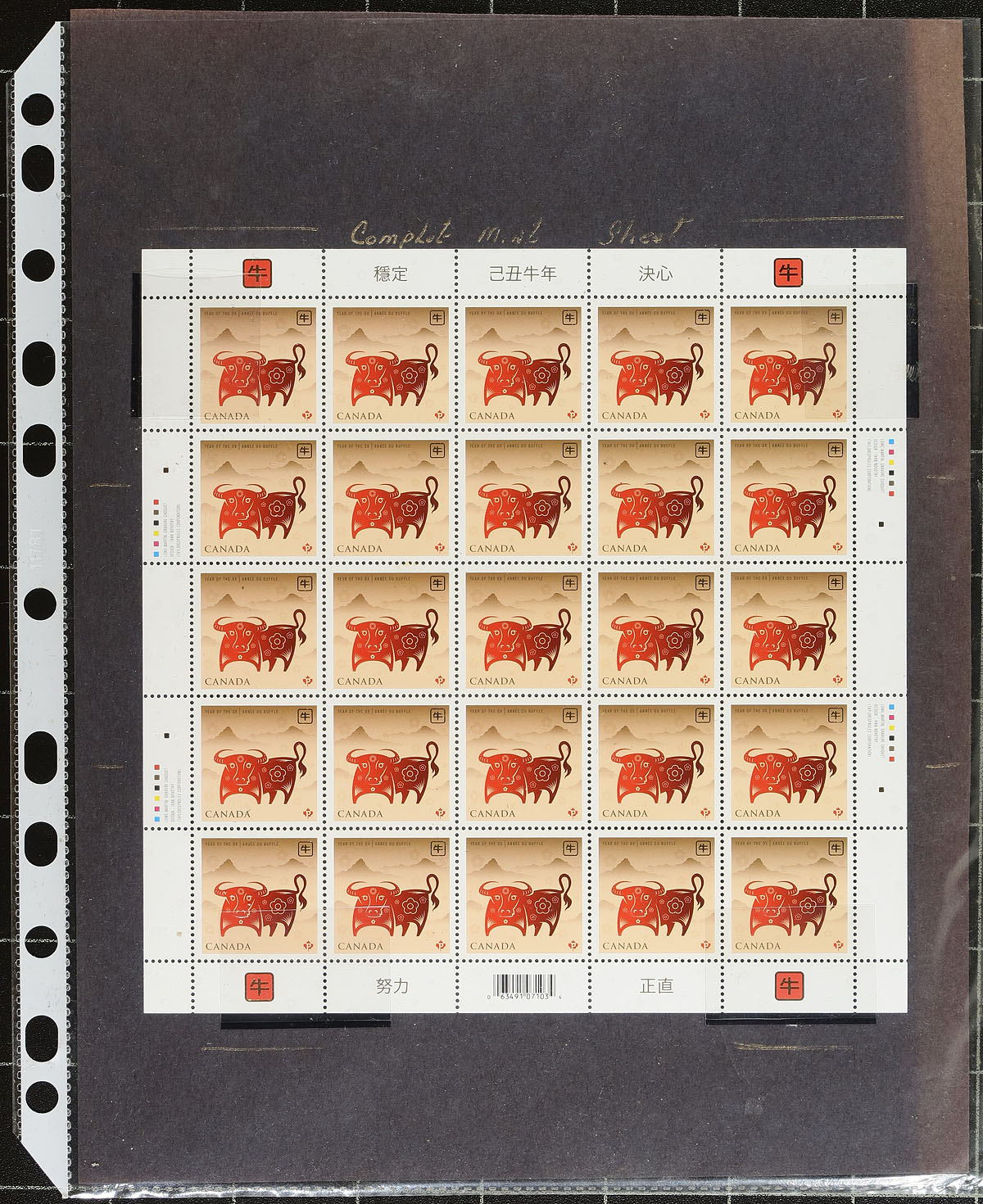 Lovely collection of primarily mint never hinged "Lunar New Year- Year of the Ox", 2009, Covering Unitrade #s 2296-2297, all in hingeless mounts in 14 well described pages. The collection contains mint and used singles, 2 mint sheets, matched set of mint and used plate blocks, mint and used souvenir sheets, and a few official first day covers. Face value alone totals $98.00 (includes 77x "P" stamps). A lovely collection for any Canada collector. 2024 Unitrade =