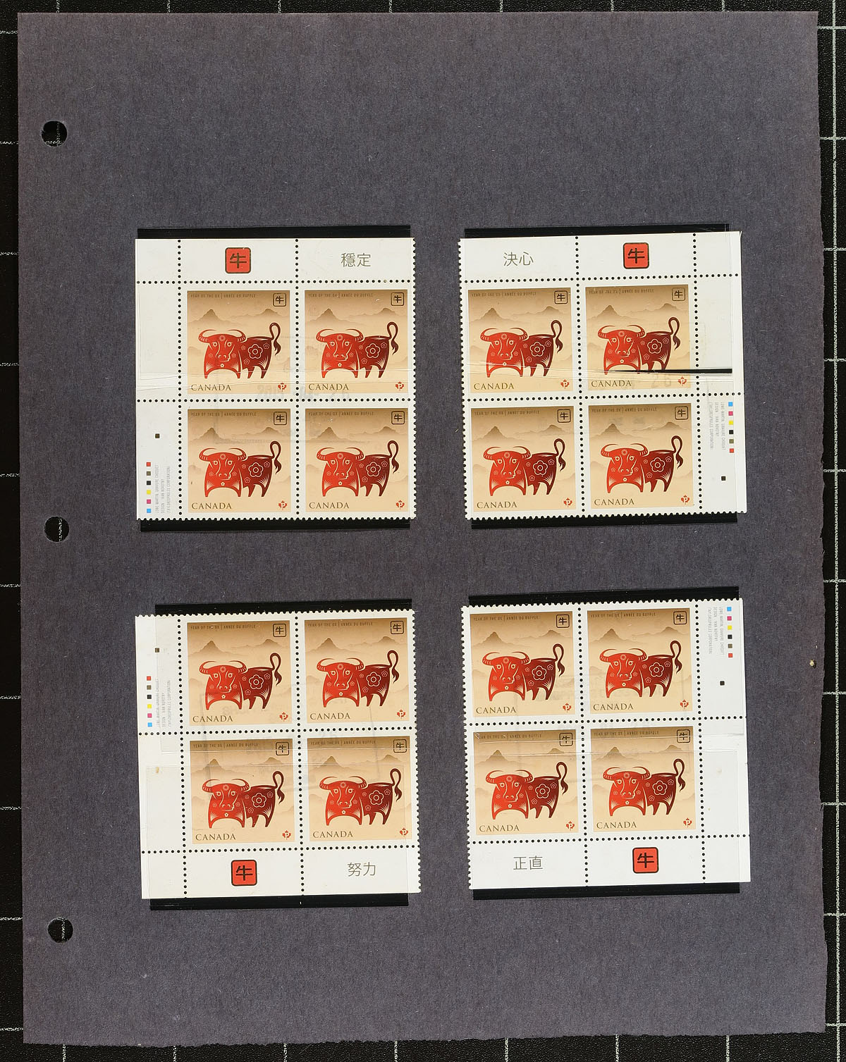 Lovely collection of primarily mint never hinged "Lunar New Year- Year of the Ox", 2009, Covering Unitrade #s 2296-2297, all in hingeless mounts in 14 well described pages. The collection contains mint and used singles, 2 mint sheets, matched set of mint and used plate blocks, mint and used souvenir sheets, and a few official first day covers. Face value alone totals $98.00 (includes 77x "P" stamps). A lovely collection for any Canada collector. 2024 Unitrade =