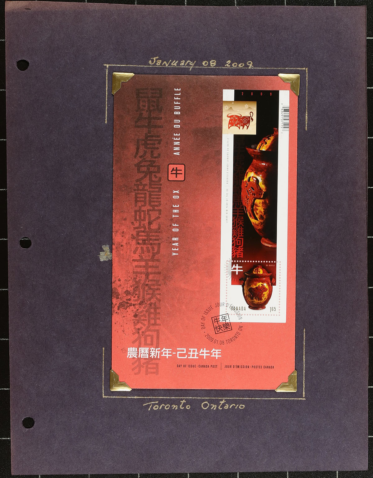 Lovely collection of primarily mint never hinged "Lunar New Year- Year of the Ox", 2009, Covering Unitrade #s 2296-2297, all in hingeless mounts in 14 well described pages. The collection contains mint and used singles, 2 mint sheets, matched set of mint and used plate blocks, mint and used souvenir sheets, and a few official first day covers. Face value alone totals $98.00 (includes 77x "P" stamps). A lovely collection for any Canada collector. 2024 Unitrade =