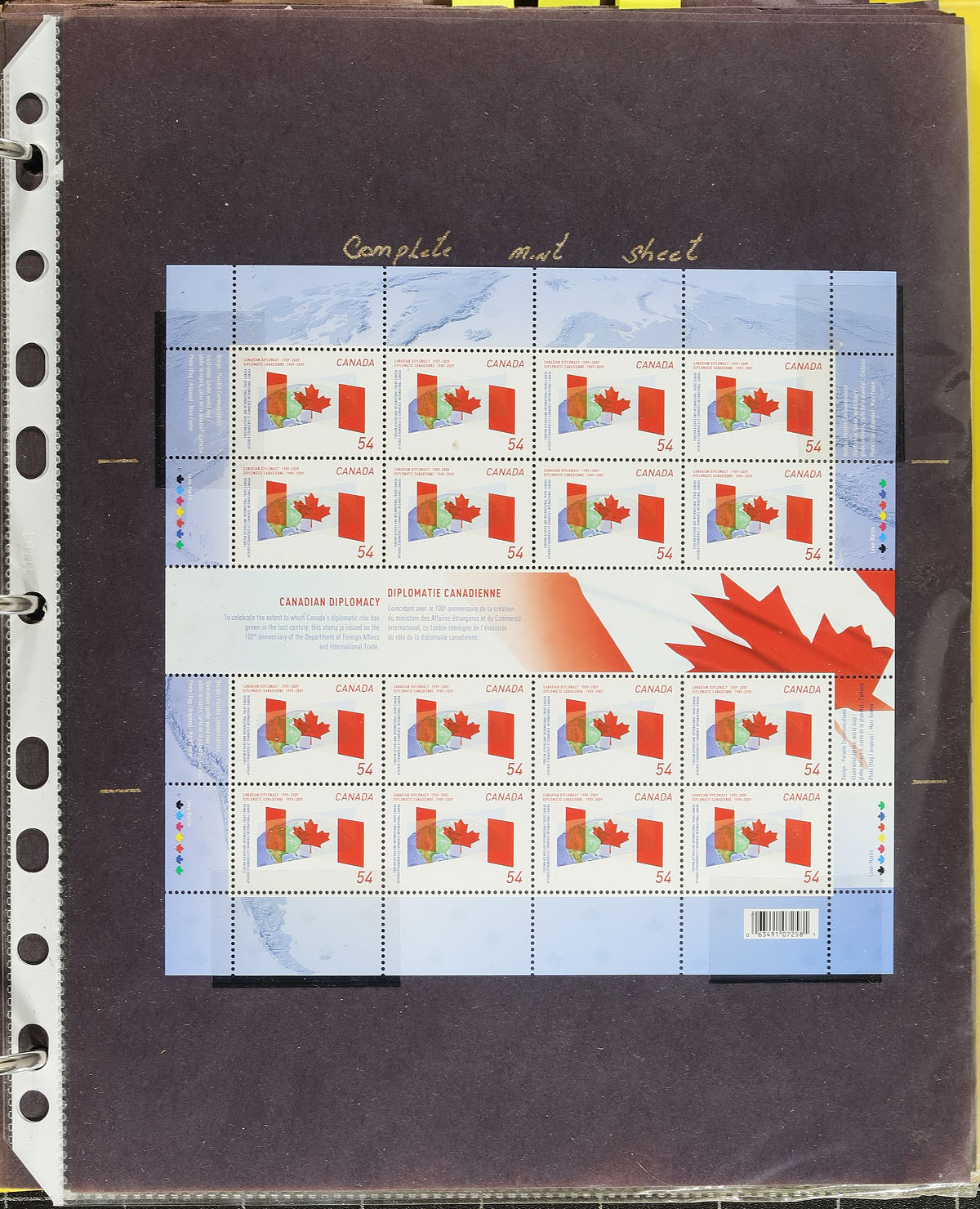Collection of primarily mint never hinged Canada, from June to October of 2009, covering Unitrade #s 2331-2342, all in hingeless mounts in over 50 well described pages, housed in a thick binder. The collection contains mint and used singles (including booklet stamps), multiples, matched set of plate blocks (including used sets), for some issues, along with a few souvenir sheets and sheetlets (mint and a few used), booklets, and first day covers. We note several match sets cataloguing $10 and up. Face value alone totals $217.00 (includes 56x "P" stamps). A nice comprehensive collection that would be difficult to duplicate. 2024 Unitrade =