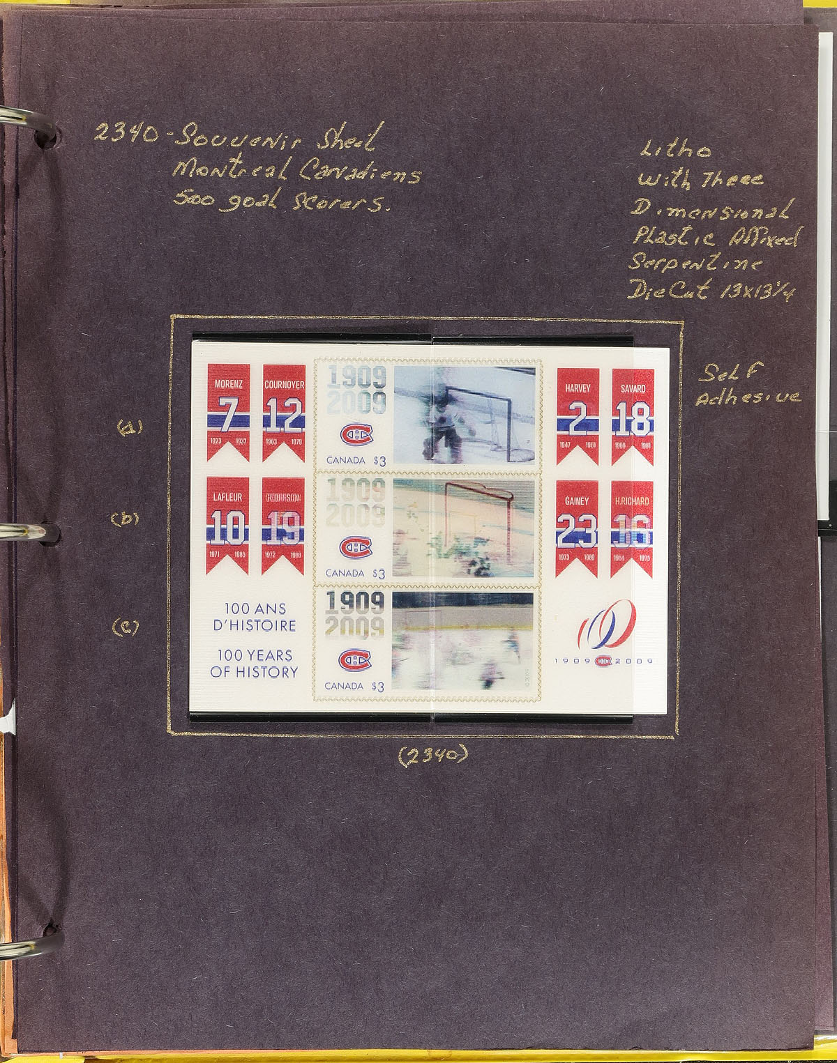 Collection of primarily mint never hinged Canada, from June to October of 2009, covering Unitrade #s 2331-2342, all in hingeless mounts in over 50 well described pages, housed in a thick binder. The collection contains mint and used singles (including booklet stamps), multiples, matched set of plate blocks (including used sets), for some issues, along with a few souvenir sheets and sheetlets (mint and a few used), booklets, and first day covers. We note several match sets cataloguing $10 and up. Face value alone totals $217.00 (includes 56x "P" stamps). A nice comprehensive collection that would be difficult to duplicate. 2024 Unitrade =