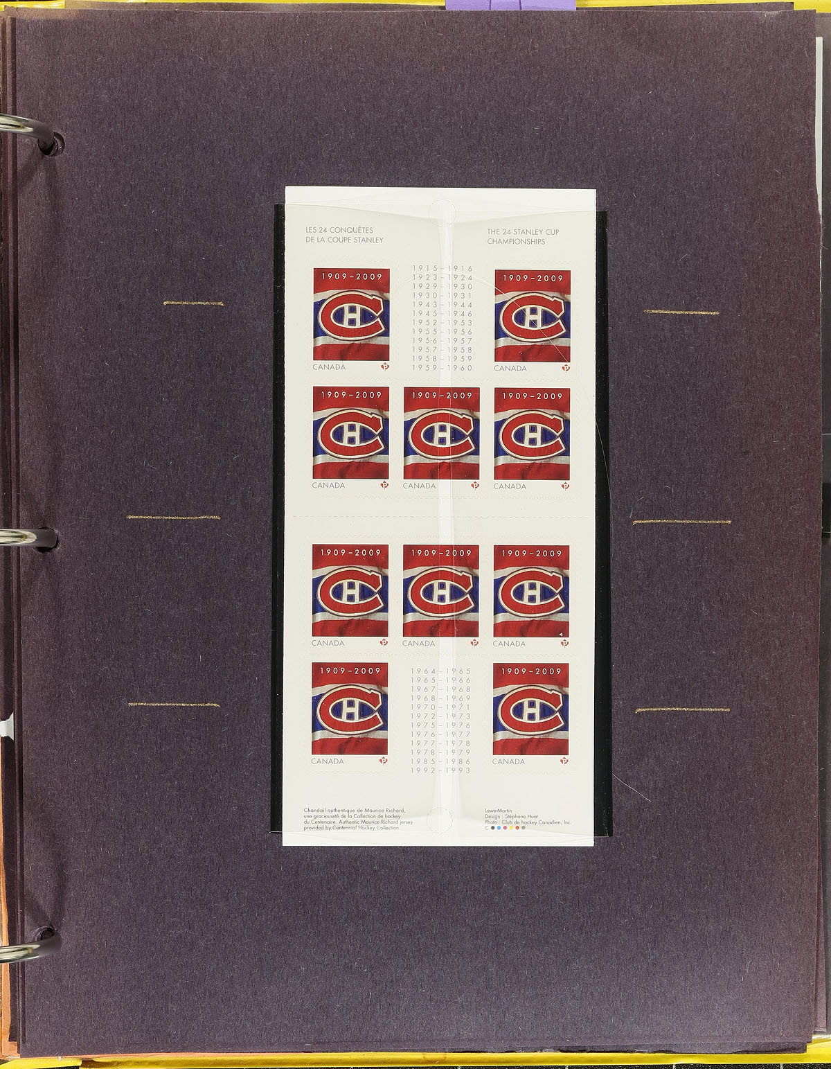 Collection of primarily mint never hinged Canada, from June to October of 2009, covering Unitrade #s 2331-2342, all in hingeless mounts in over 50 well described pages, housed in a thick binder. The collection contains mint and used singles (including booklet stamps), multiples, matched set of plate blocks (including used sets), for some issues, along with a few souvenir sheets and sheetlets (mint and a few used), booklets, and first day covers. We note several match sets cataloguing $10 and up. Face value alone totals $217.00 (includes 56x "P" stamps). A nice comprehensive collection that would be difficult to duplicate. 2024 Unitrade =