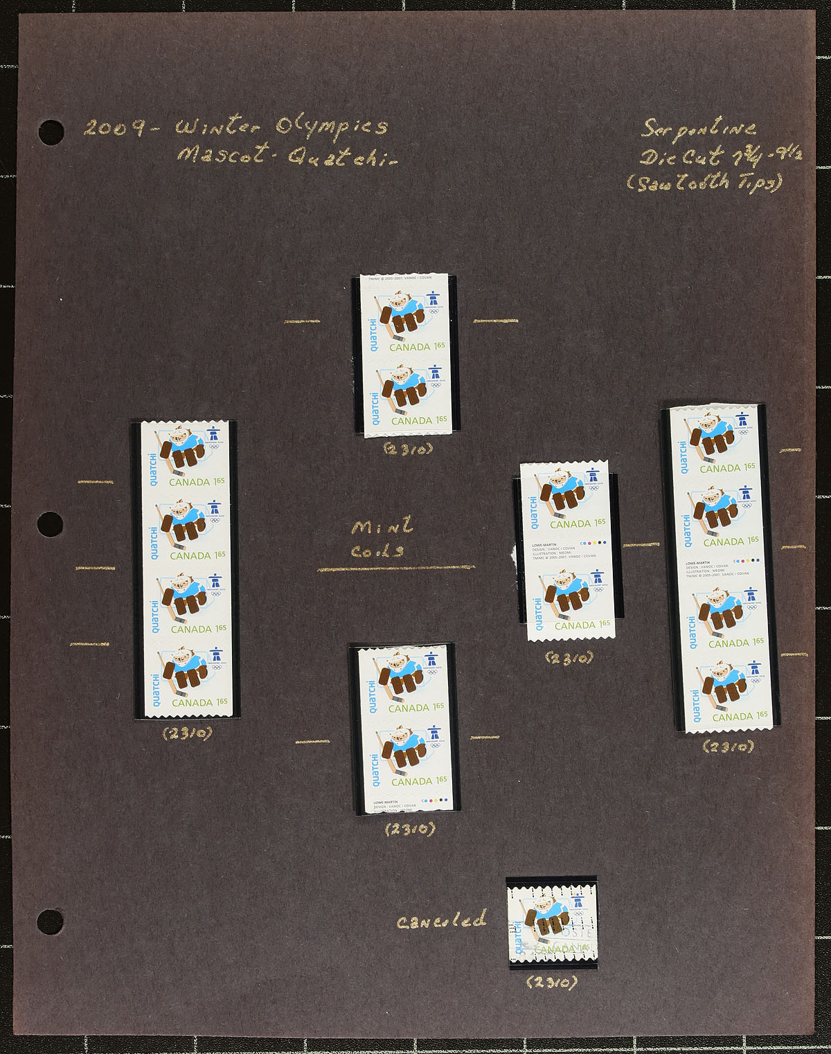 In-depth collection of primarily mint never hinged definitive issues, January 2009, covering Unitrade #s 2298-2313, all in hingeless mounts in roughly 20 well described pages. The collection contains mint and used singles (including booklet stamps), booklets, souvenir sheets, coil singles, pairs, and strips of 4, along with a few first day covers. We note some better items cataloguing $15.00 and up. Face value alone totals $269.00 (includes 146x "P" stamps). A nice comprehensive collection that would be difficult to duplicate. 2024 Unitrade =